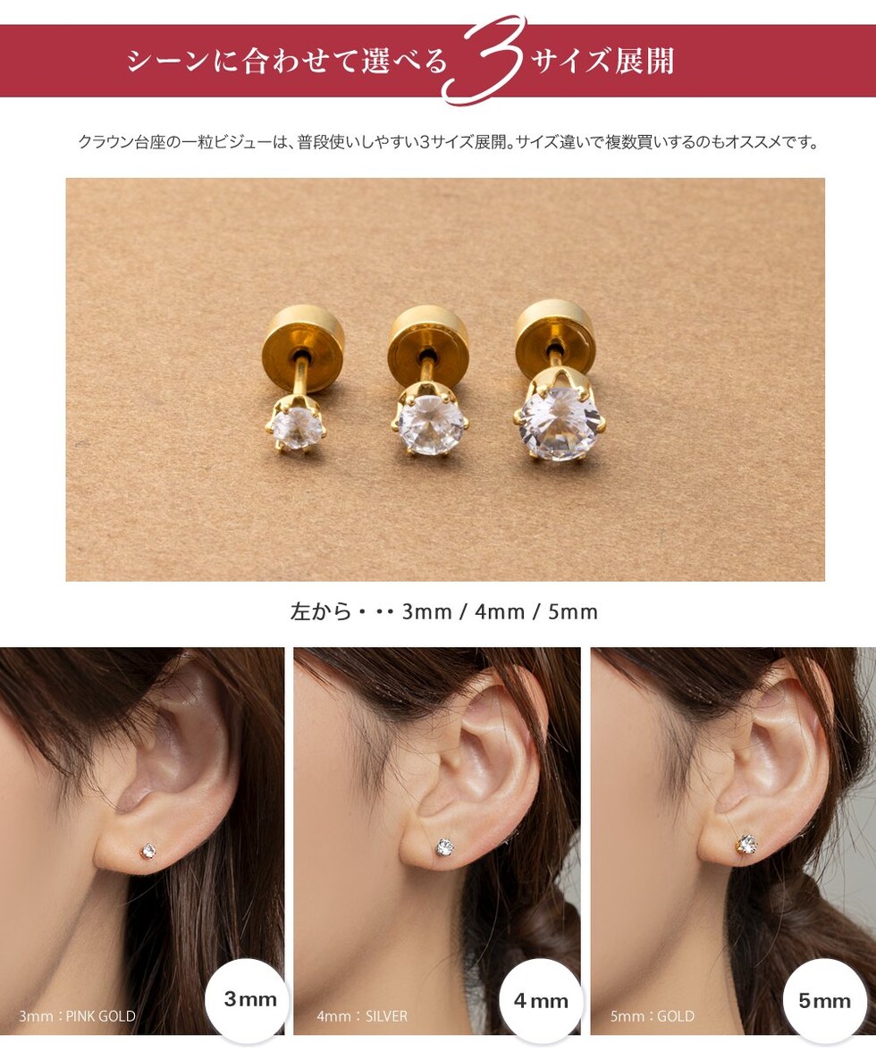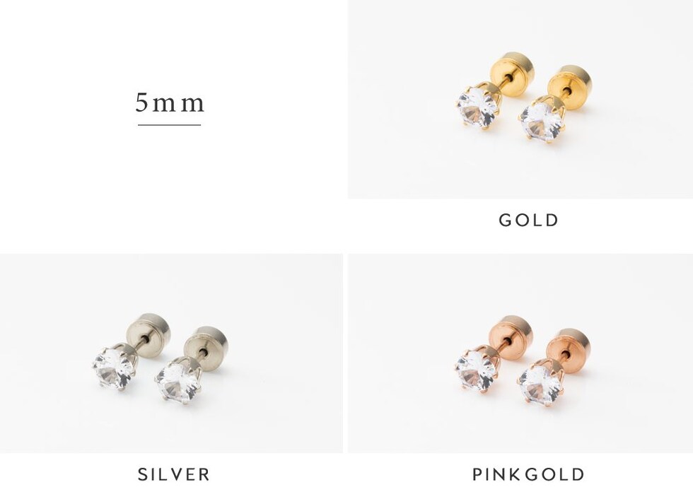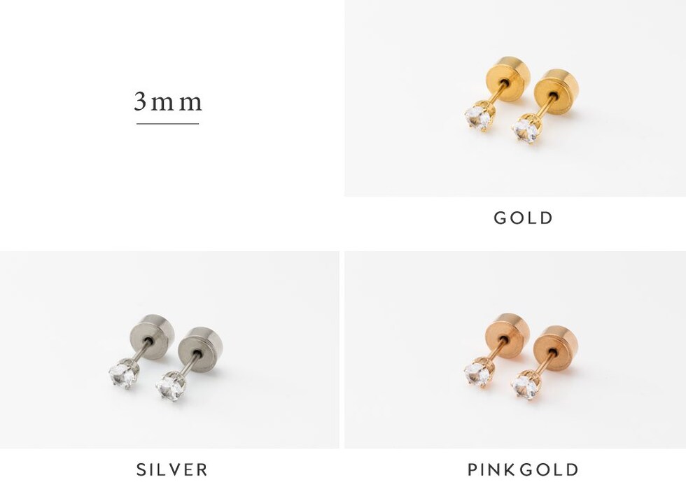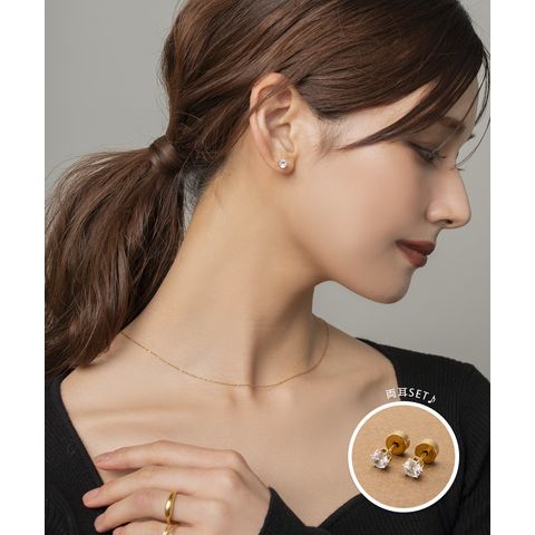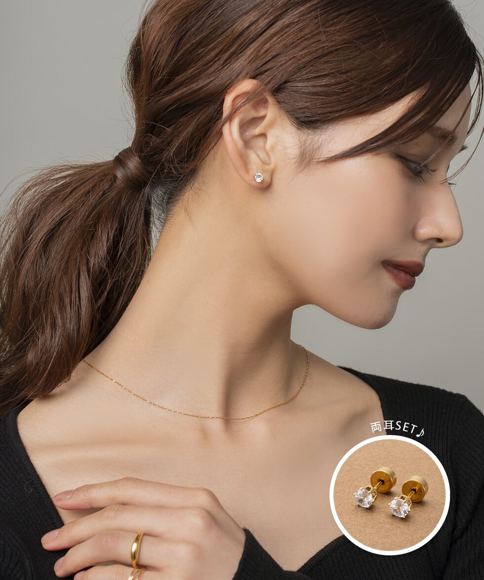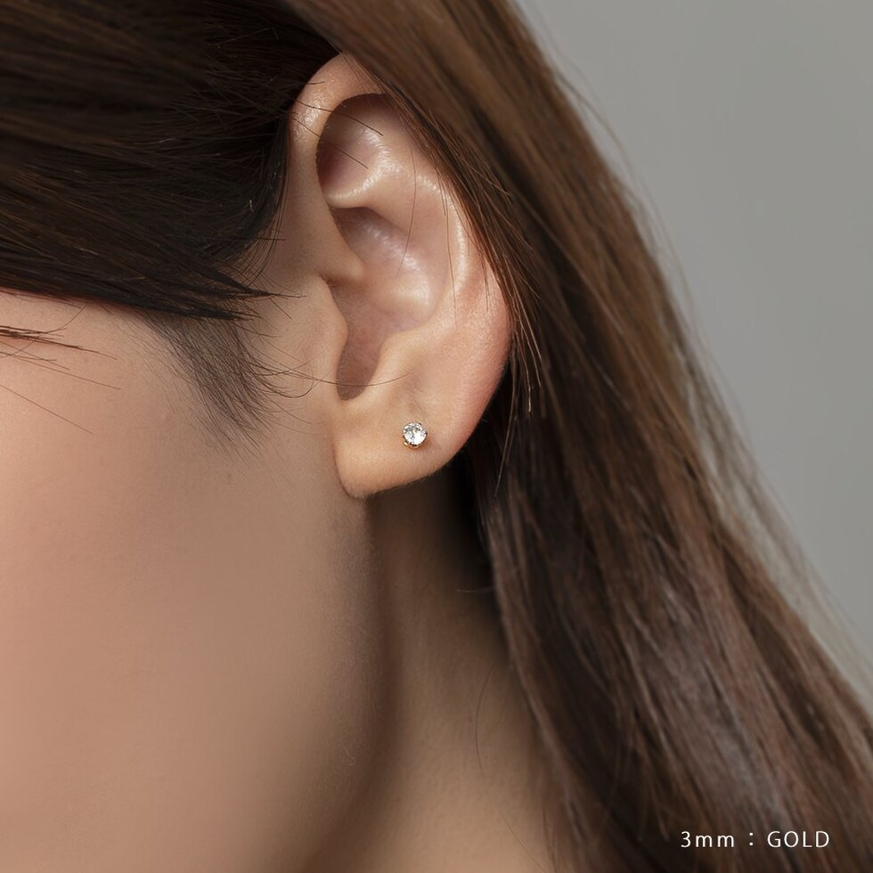 3mm~5mmのビジューから選べるプッシュロックピアス。押してロックが掛かる仕様で瞬時に着用&落とさず無くす心配もないひと品。耳裏を痛めないセーフティーキャッチも魅力的。