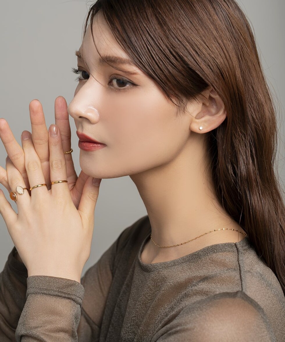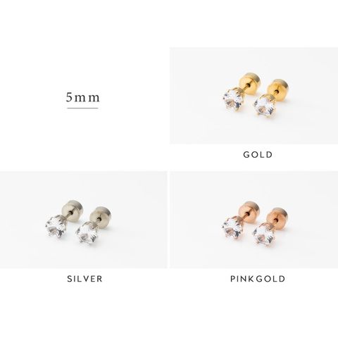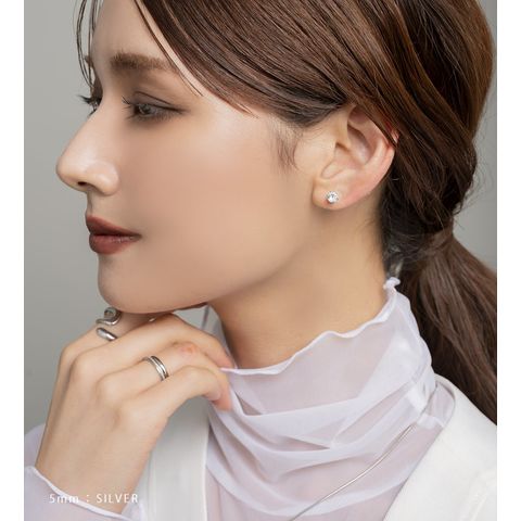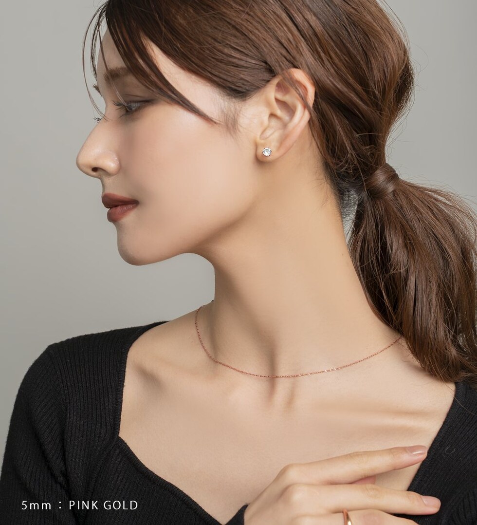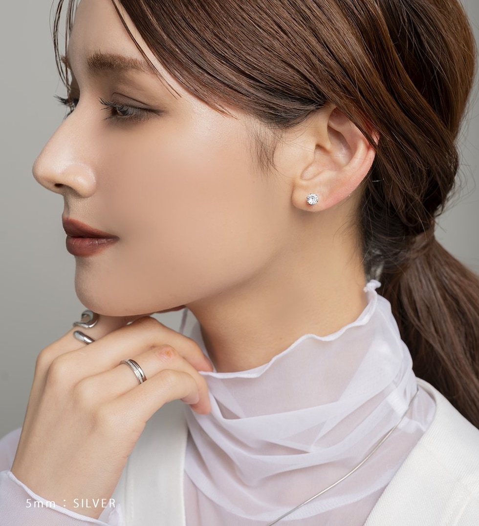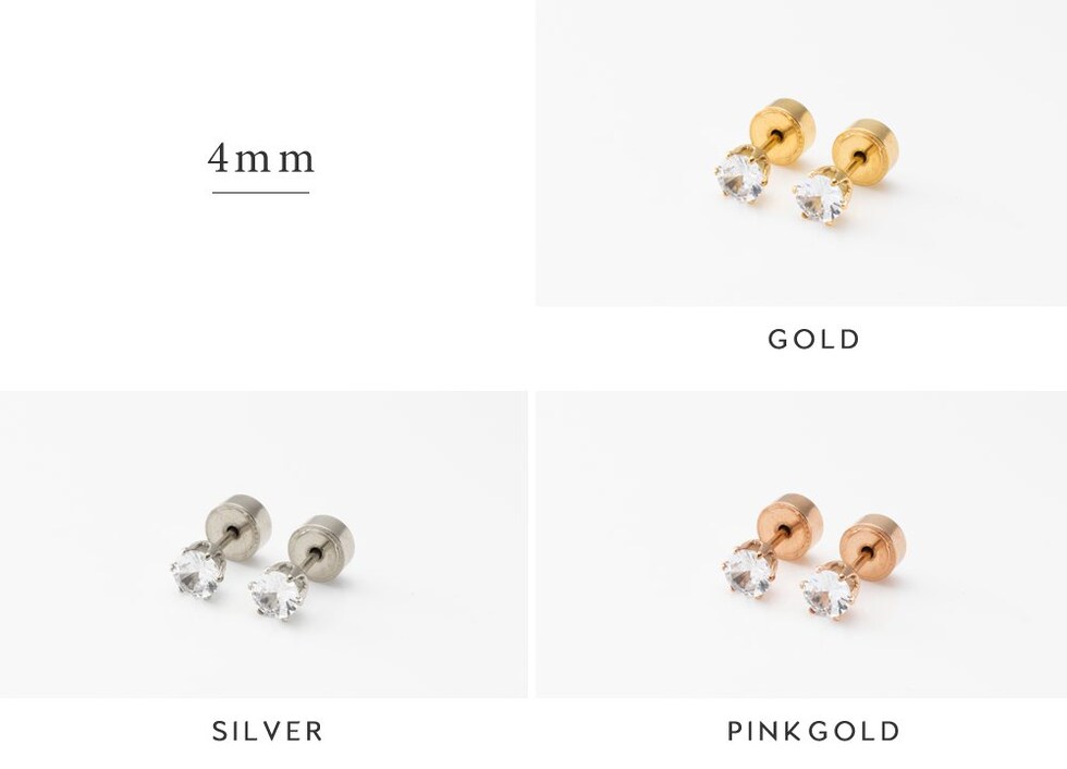 3mm~5mmのビジューから選べるプッシュロックピアス。押してロックが掛かる仕様で瞬時に着用&落とさず無くす心配もないひと品。耳裏を痛めないセーフティーキャッチも魅力的。