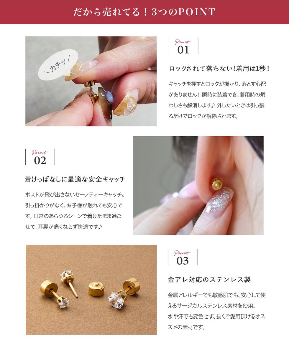 ポストが飛び出さないセーフティーキャッチ。引っ掛かりがなく、お子様が触れても安心です。日常のあらゆるシーンで着けたまま過ごせて、耳裏が痛くならず快適です♪