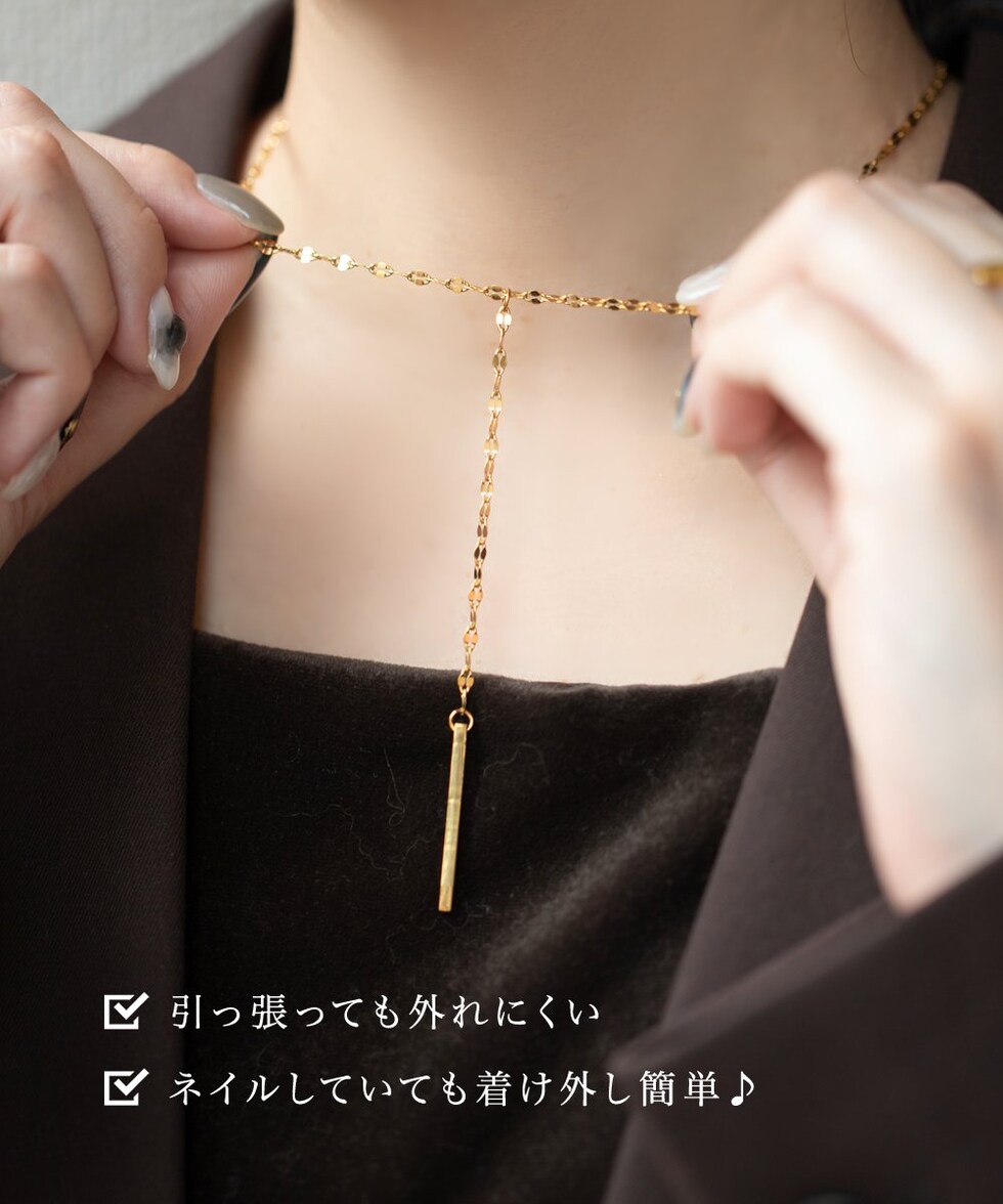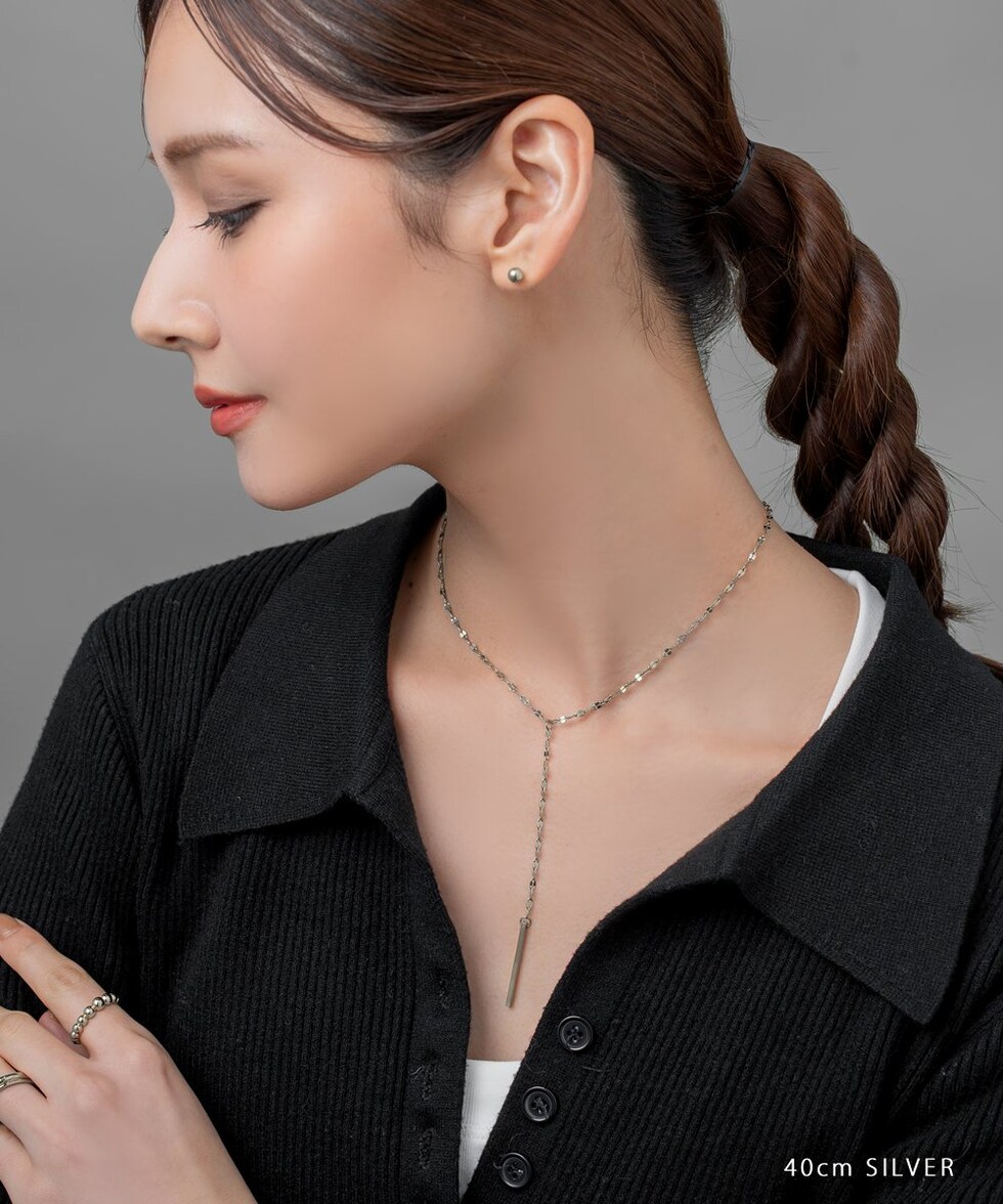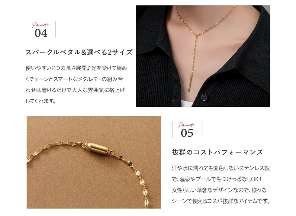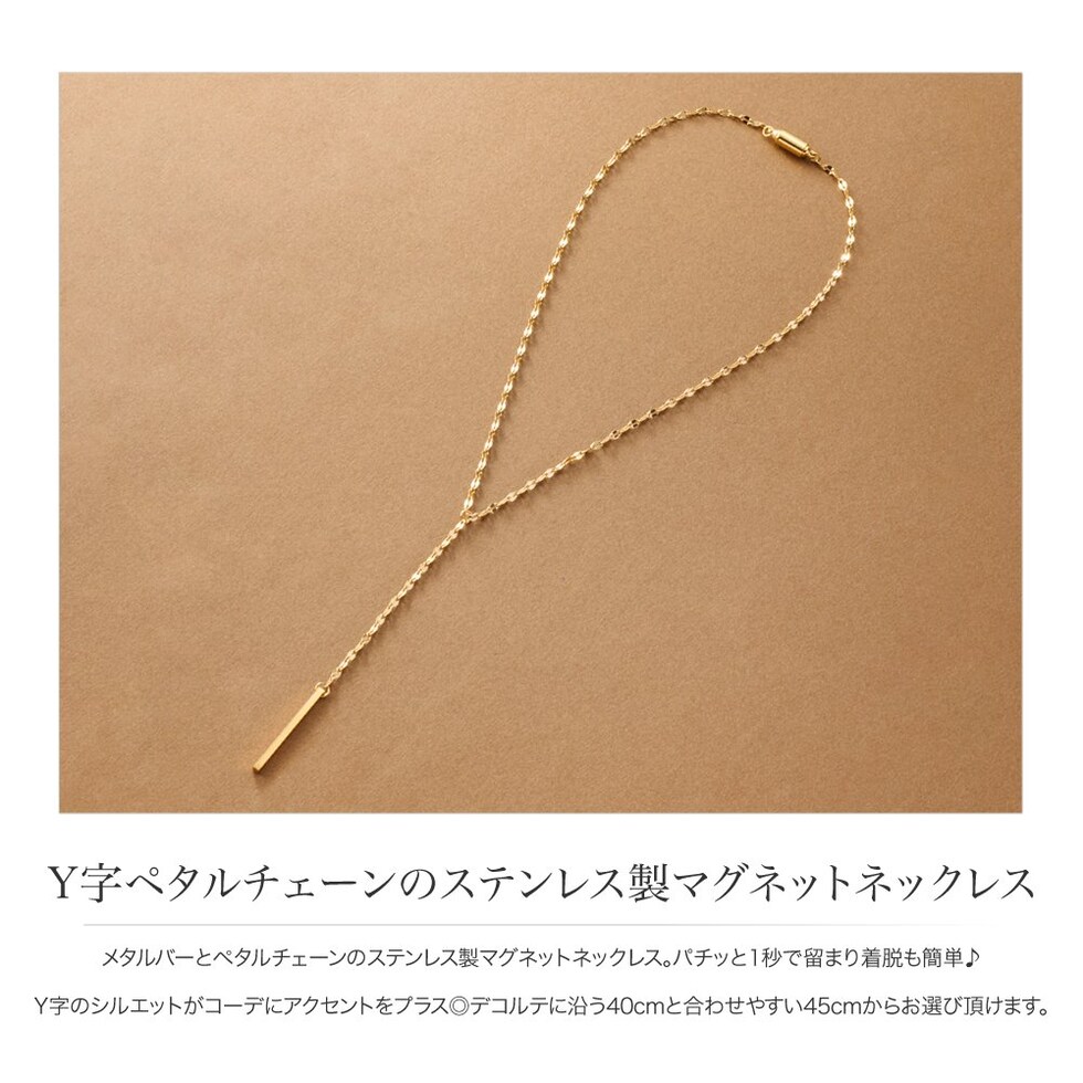 メタルバーとペタルチェーンのステンレス製マグネットネックレス。パチッと1秒で留まり着脱も簡単♪Y字のシルエットがコーデにアクセントをプラス◎デコルテに沿う40cmと合わせやすい45cmからお選び頂けます。