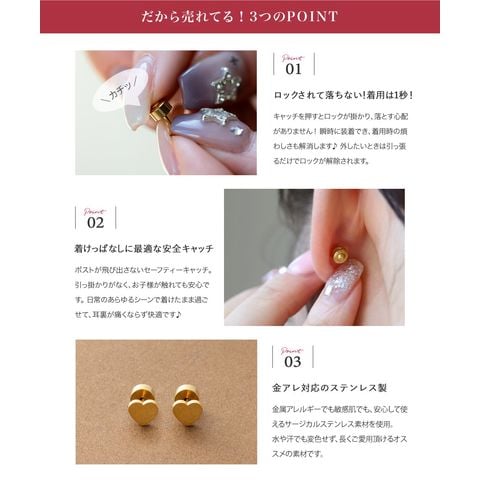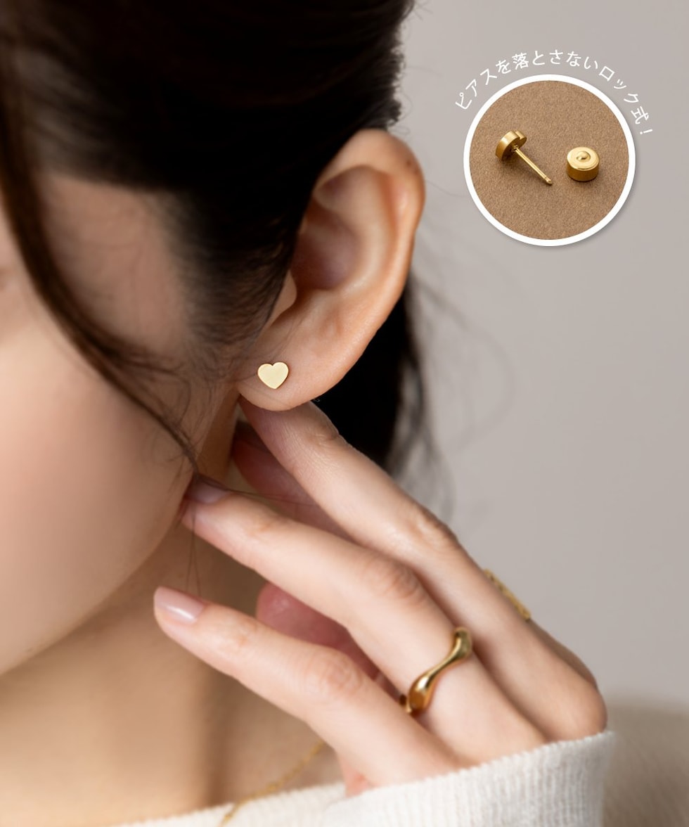 ミニハートのモチーフが大人可愛いプッシュロックピアス。押してロックが掛かる仕様で瞬時に着用&落とさず無くす心配もないひと品。耳裏を痛めないセーフティーキャッチも魅力的。