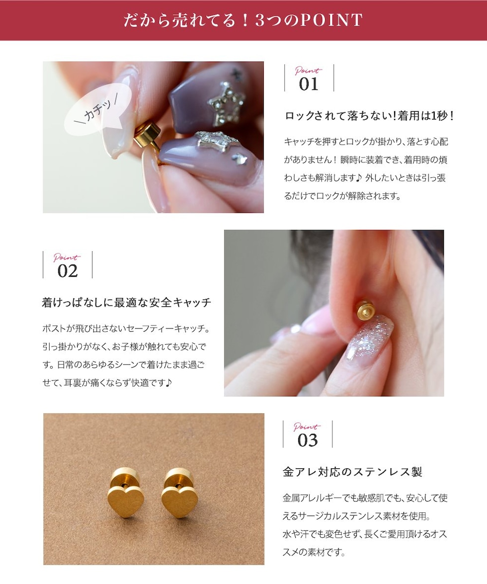 ポストが飛び出さないセーフティーキャッチ。引っ掛かりがなく、お子様が触れても安心です。日常のあらゆるシーンで着けたまま過ごせて、耳裏が痛くならず快適です♪