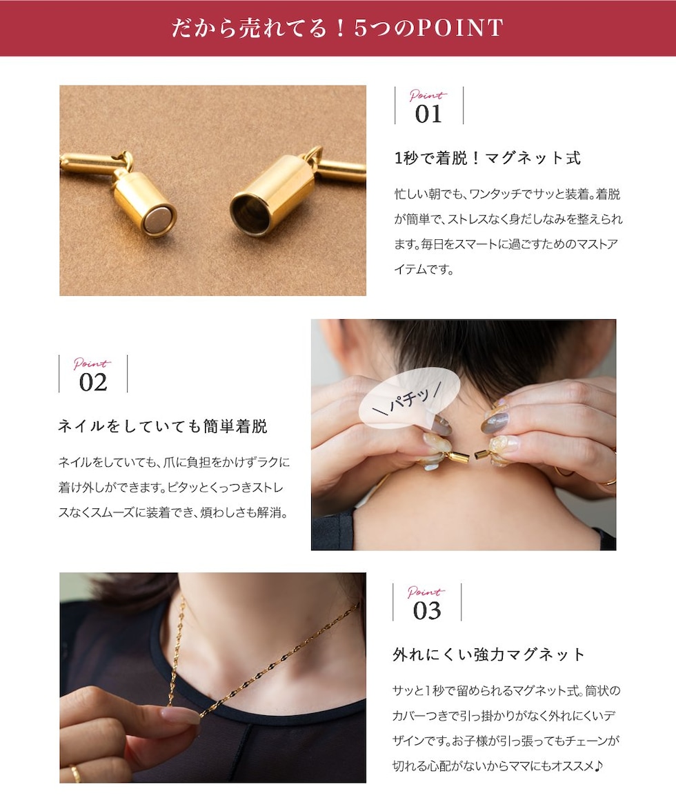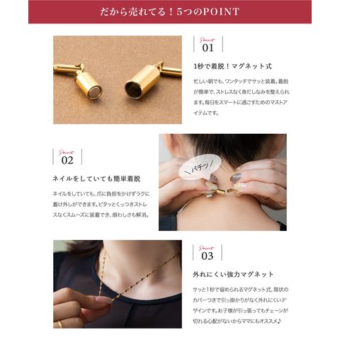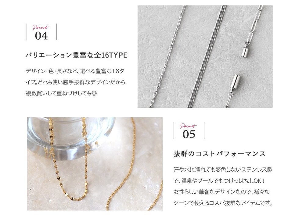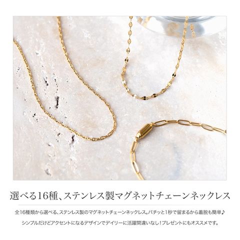 全16種類から選べる、ステンレス製のマグネットチェーンネックレス。パチッと1秒で留まるから着脱も簡単♪シンプルだけどアクセントになるデザインでデイリーに活躍間違いなし!プレゼントにもオススメです。