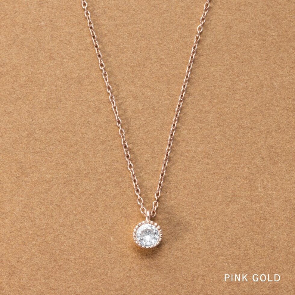 繊細なミル打ちデザインに囲まれた一粒ビジューが上品に煌めきます。飽きのこないシンプルなネックレスは一つ持っておけばヘビロテ間違いなしのアイテムです。