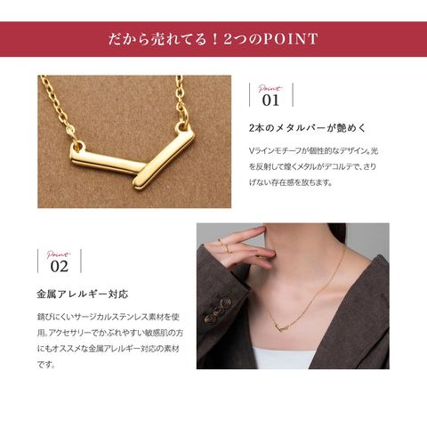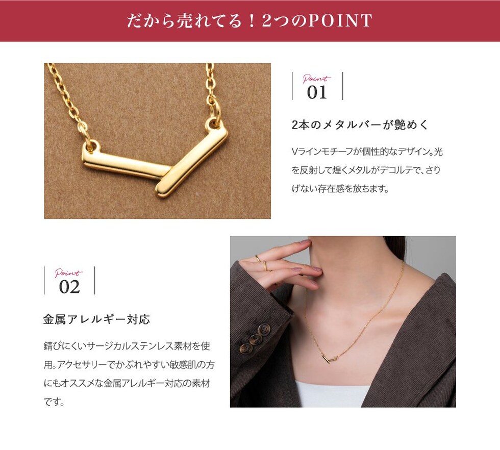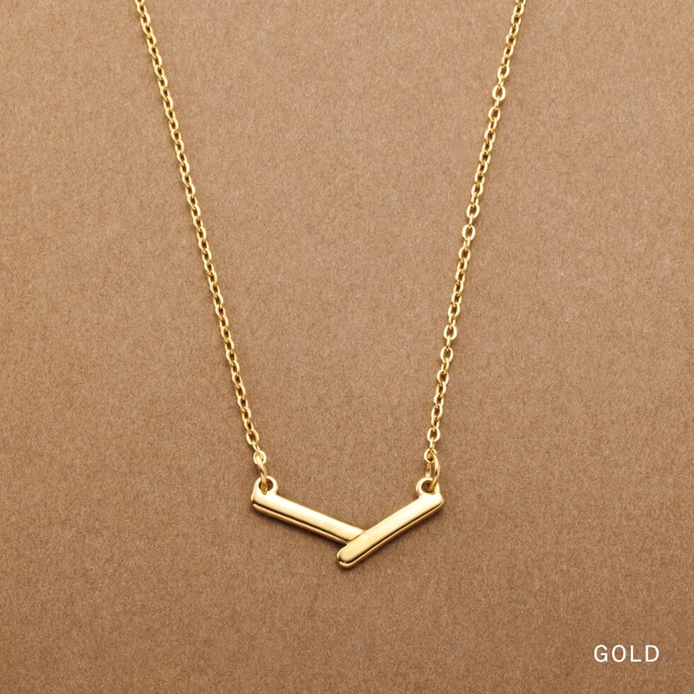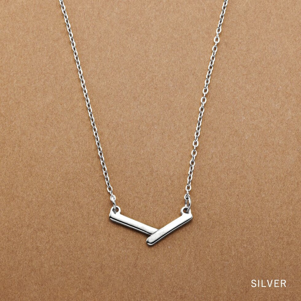 メタルバーが重なったV字モチーフのネックレス。スリムなメタルラインが、こなれ感と洗練された印象を演出。大人モードな雰囲気をさりげなくプラスしてくれる、デイリーコーデのアクセントにピッタリなひと品です。