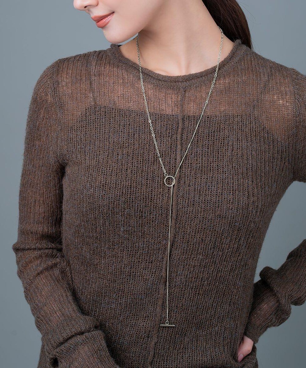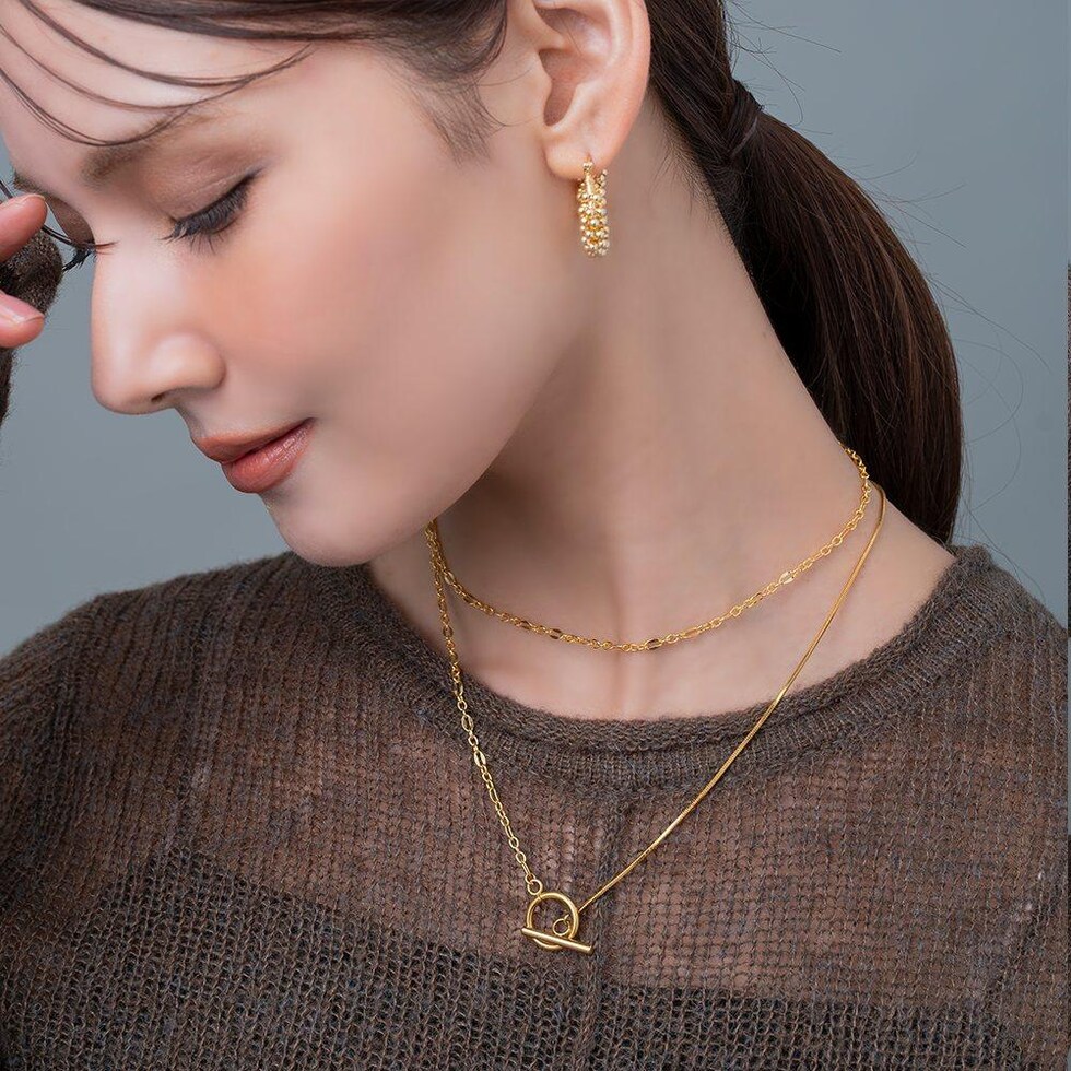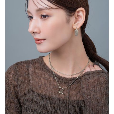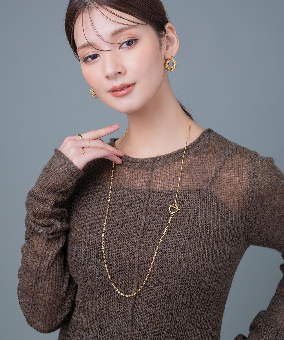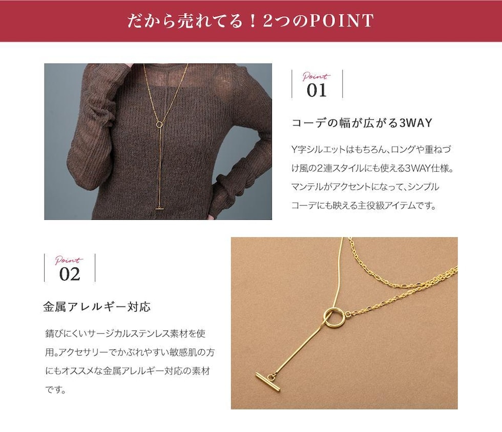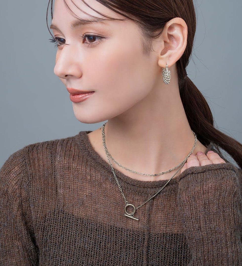 Y字シルエットはもちろん、ロングや重ねづけ風の2連スタイルにも使える3WAY仕様。マンテルがアクセントになって、シンプルコーデにも映える主役級アイテムです。