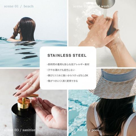 錆びにくいサージカルステンレス素材を使用。アクセサリーでかぶれやすい敏感肌の方にもオススメな金属アレルギー対応の素材です。