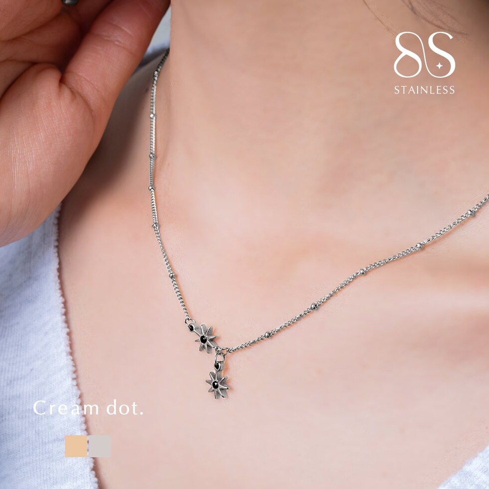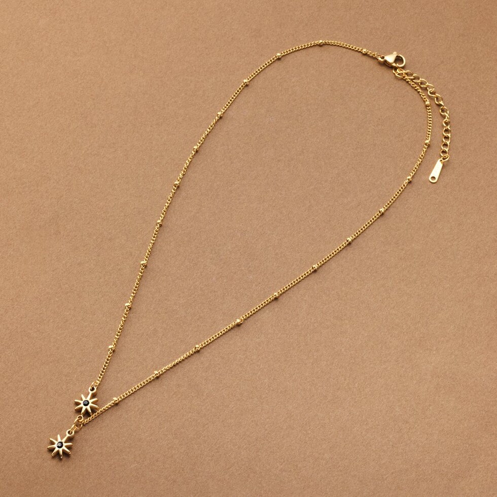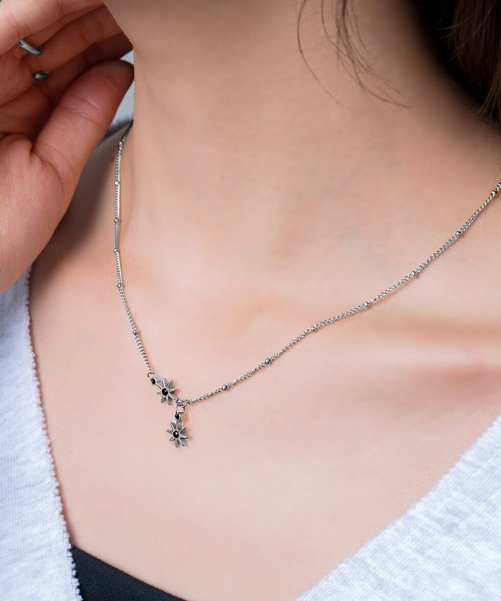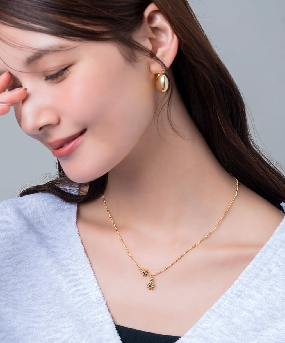 2つの星モチーフにブラックビジューをあしらったネックレス。ステーションボールチェーンとの組み合わせが、コーデにさりげないアクセントをプラスしてくれる。程よくエッジの効いたデザインで、普段使いにもピッタリです。