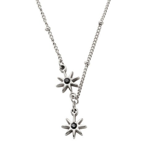 2つの星モチーフにブラックビジューをあしらったネックレス。ステーションボールチェーンとの組み合わせが、コーデにさりげないアクセントをプラスしてくれる。程よくエッジの効いたデザインで、普段使いにもピッタリです。