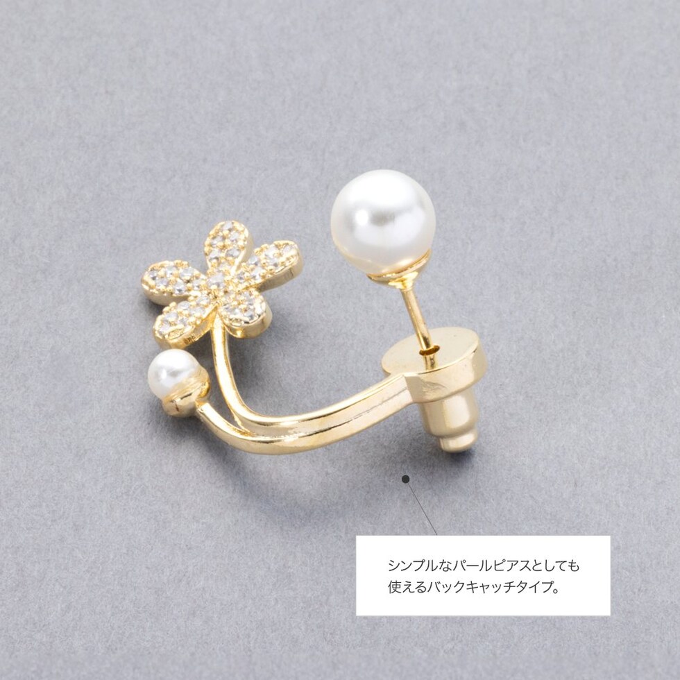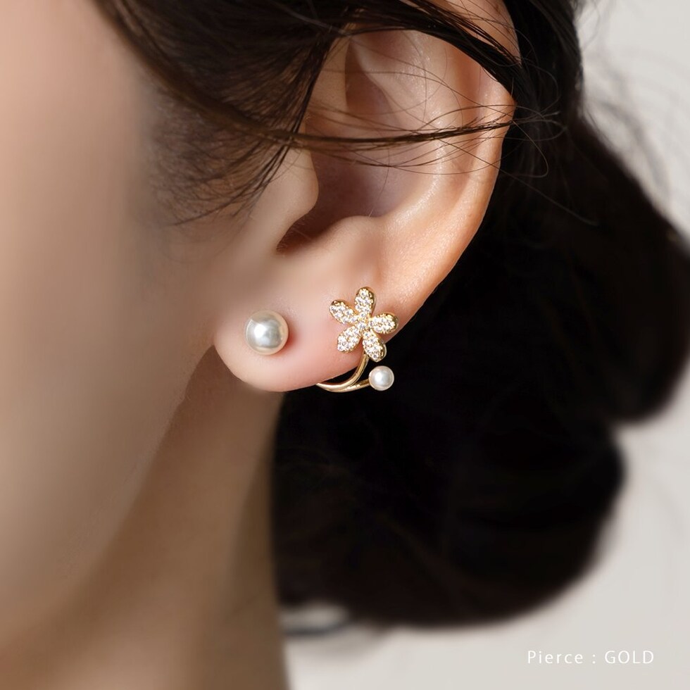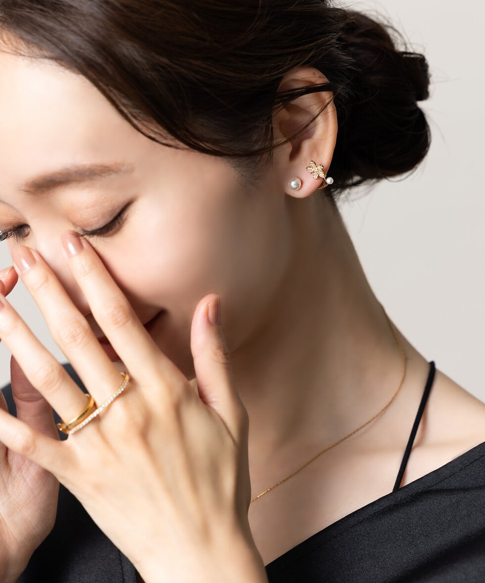耳たぶに沿うパヴェフラワー×パールのレイヤード風ピアス/イヤリング。繊細な煌めきと、重ね着けしたようなデザインが大人可愛いアイテム。普段使いはもちろん、結婚式・お呼ばれ・パーティーシーンなどで幅広く活躍しそう。