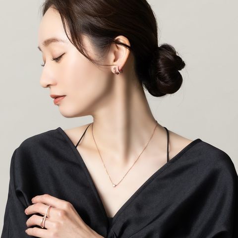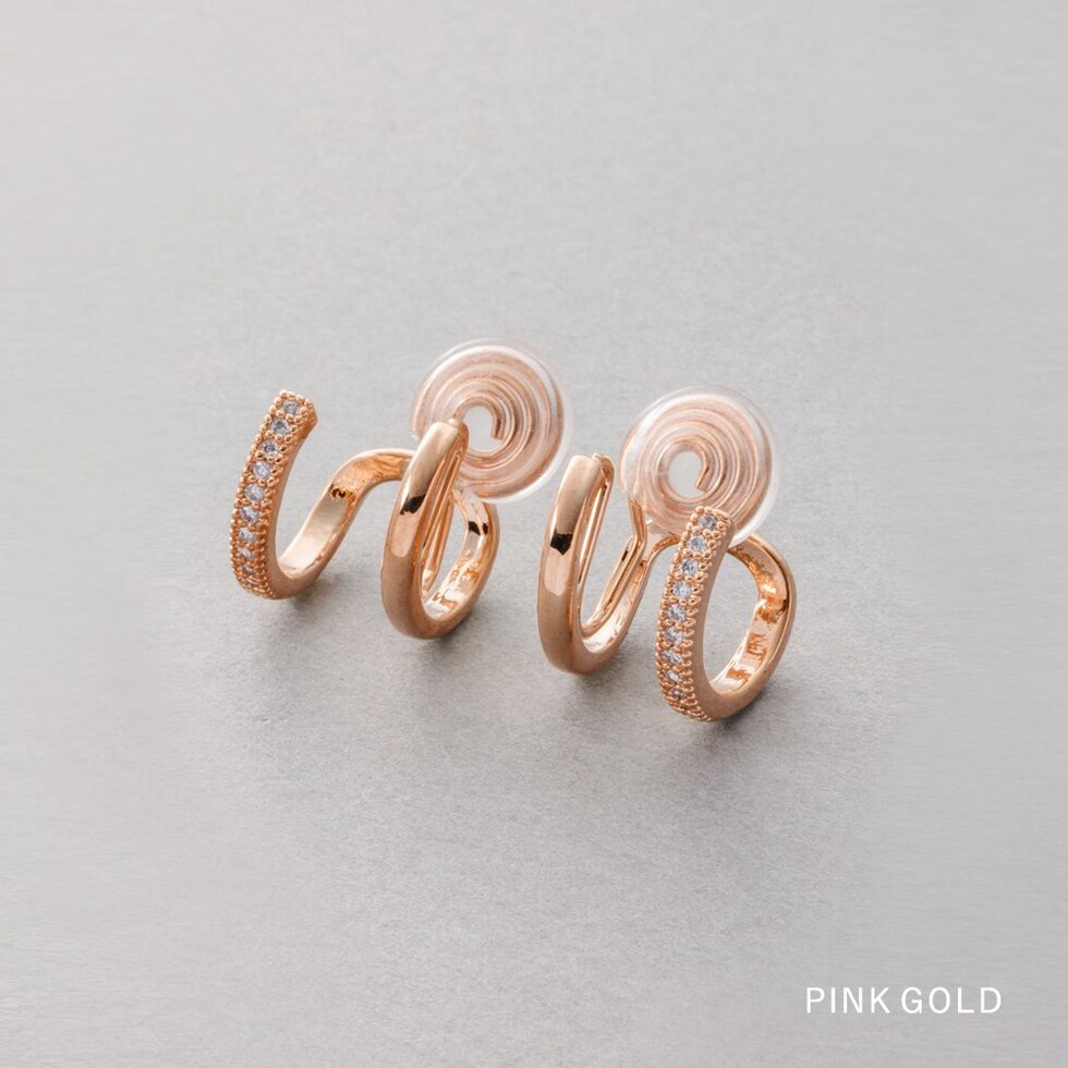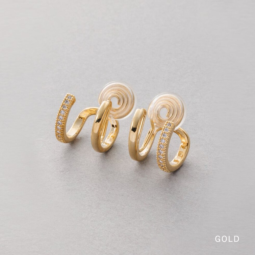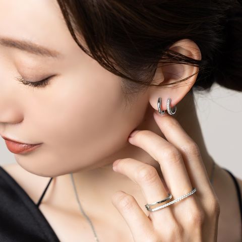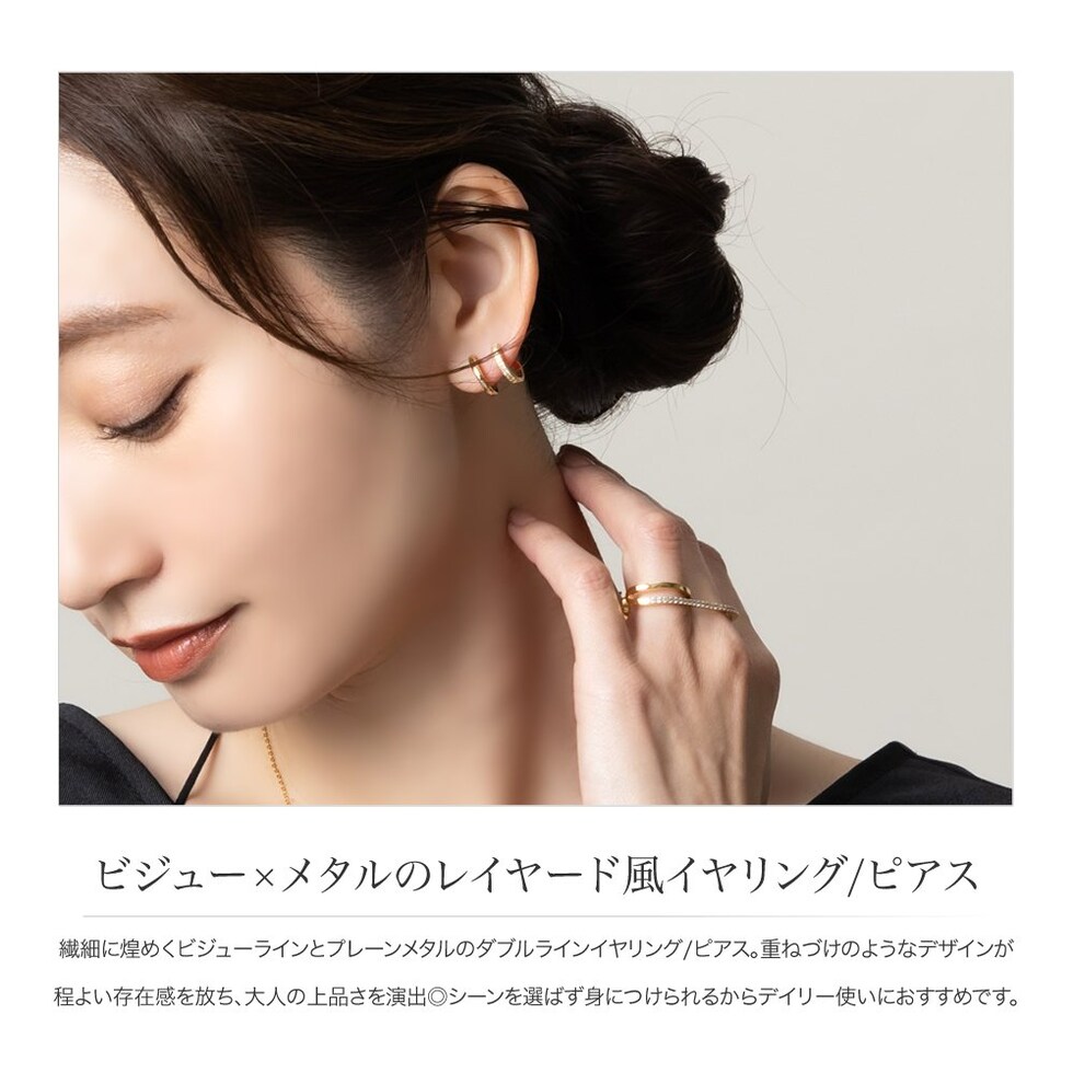 繊細に煌めくビジューラインとプレーンメタルのダブルラインイヤリング/ピアス。重ねづけのようなデザインが程よい存在感を放ち、大人の上品さを演出◎シーンを選ばず身につけられるからデイリー使いにおすすめです。