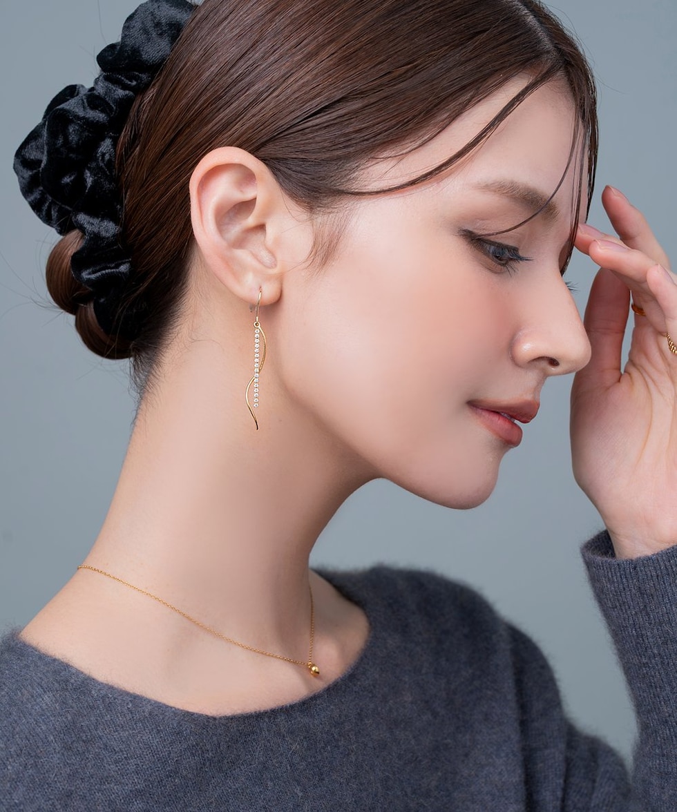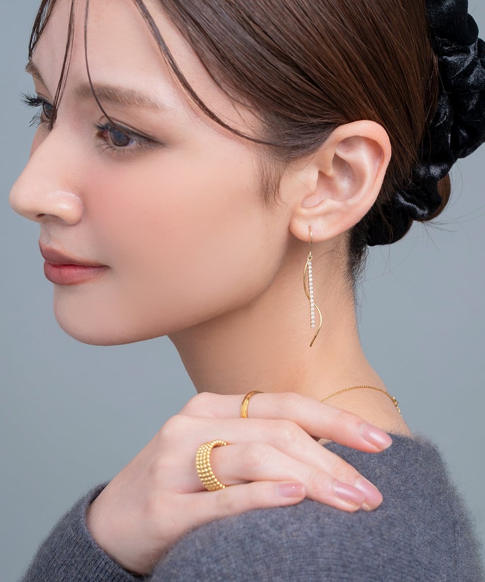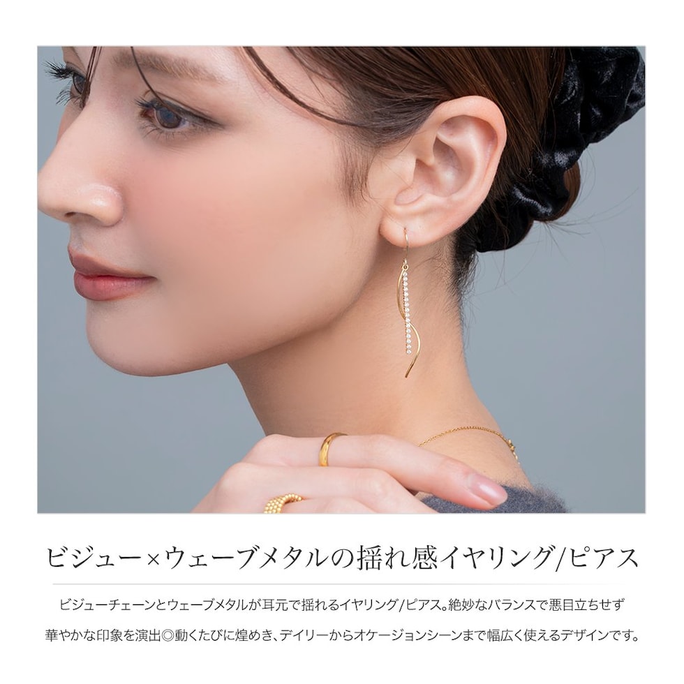 ビジューチェーンとウェーブメタルが耳元で揺れるイヤリング/ピアス。絶妙なバランスで悪目立ちせず華やかな印象を演出◎動くたびに煌めき、デイリーからオケージョンシーンまで幅広く使えるデザインです。