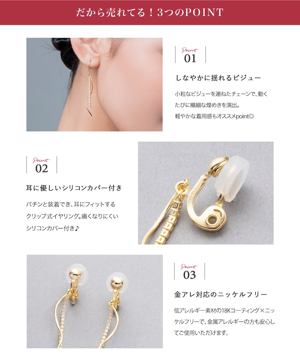 パチンと装着でき、耳にフィットするクリップ式イヤリング。痛くなりにくいシリコンカバー付き♪