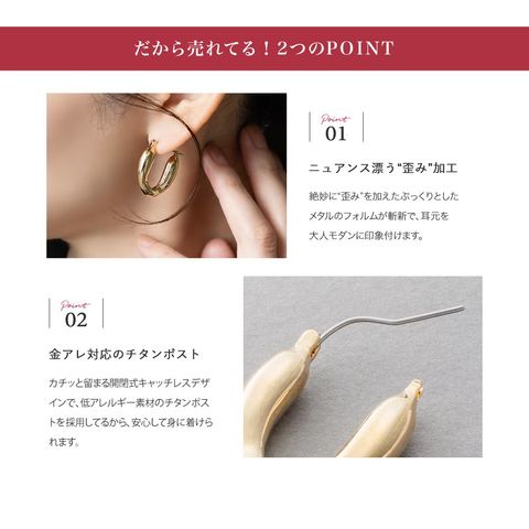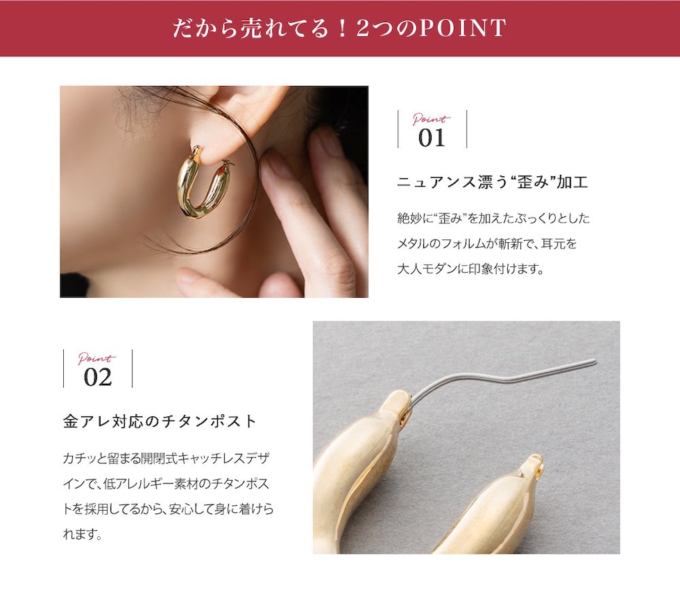 カチッと留まる開閉式キャッチレスデザインで、低アレルギー素材のチタンポストを採用してるから、安心して身に着けられます。
