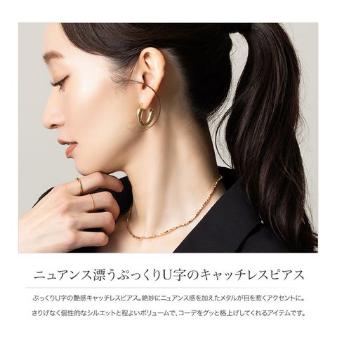 ぷっくりU字の艶感キャッチレスピアス。絶妙にニュアンス感を加えたメタルが目を惹くアクセントに。さりげなく個性的なシルエットと程よいボリュームで、コーデをグッと格上げしてくれるアイテムです。