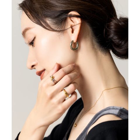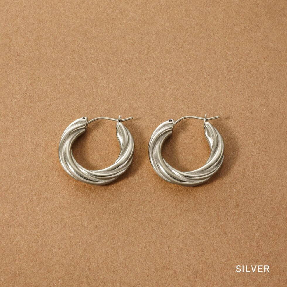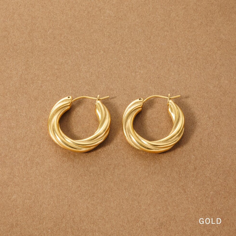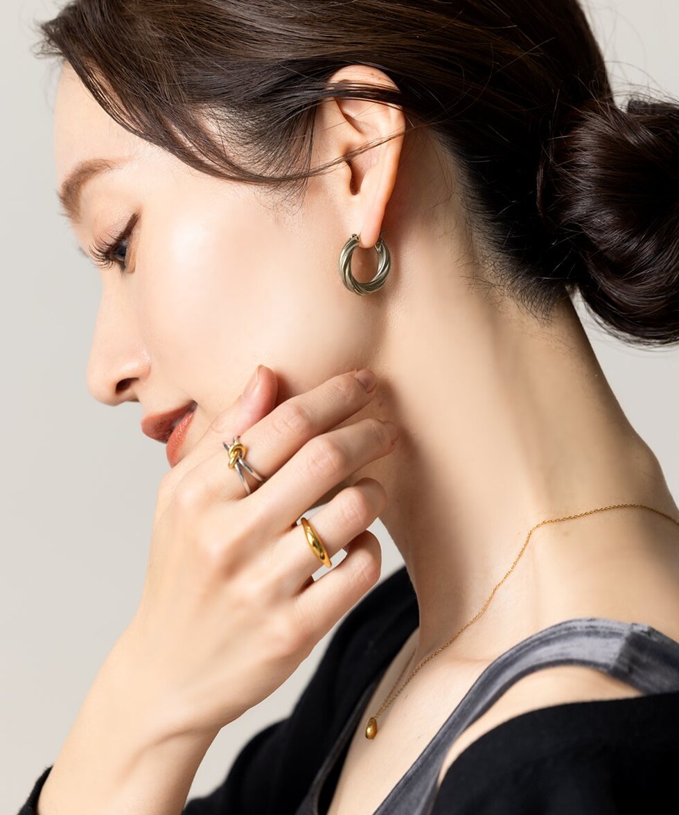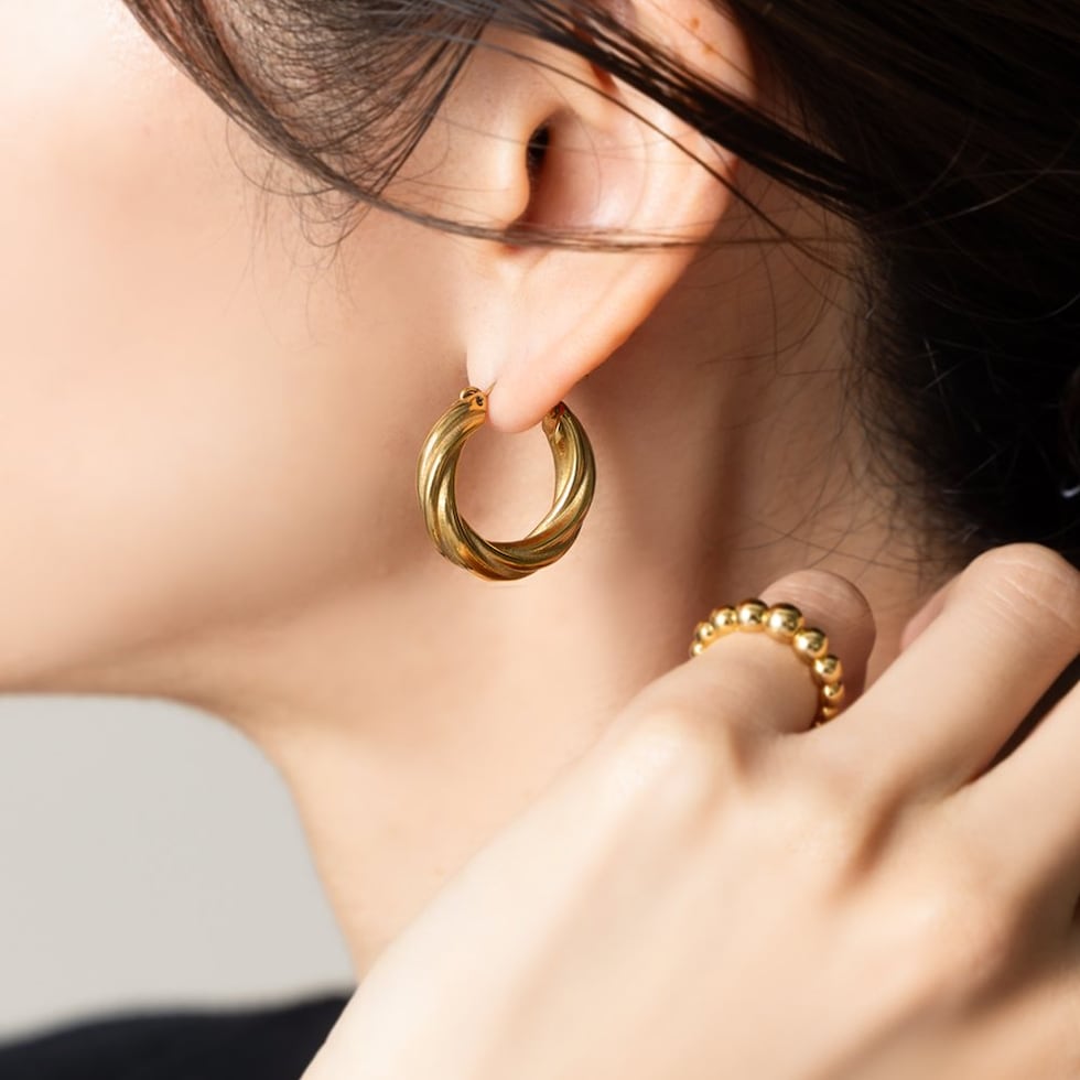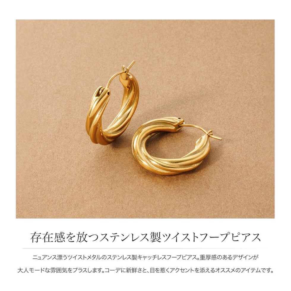 ニュアンス漂うツイストメタルのステンレス製キャッチレスフープピアス。重厚感のあるデザインが大人モードな雰囲気をプラスします。コーデに新鮮さと、目を惹くアクセントを添えるオススメのアイテムです。