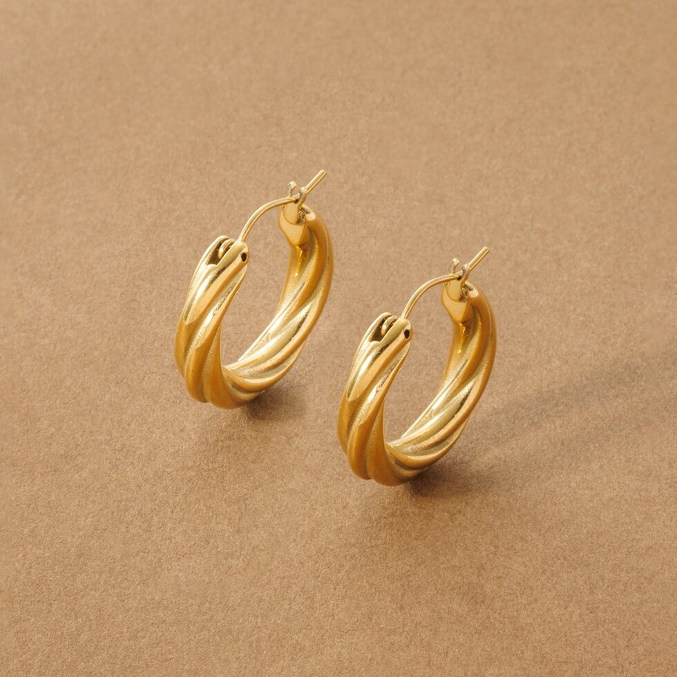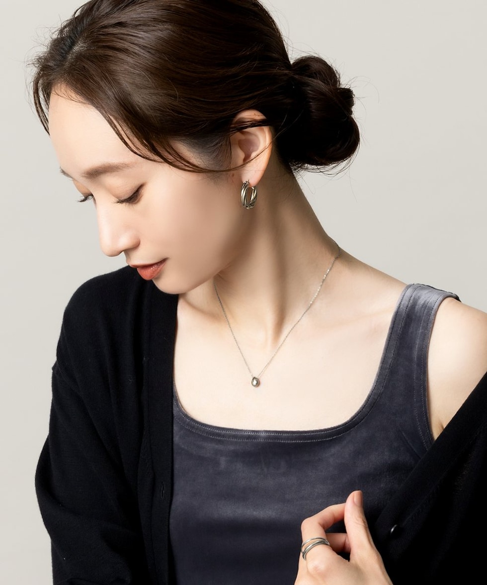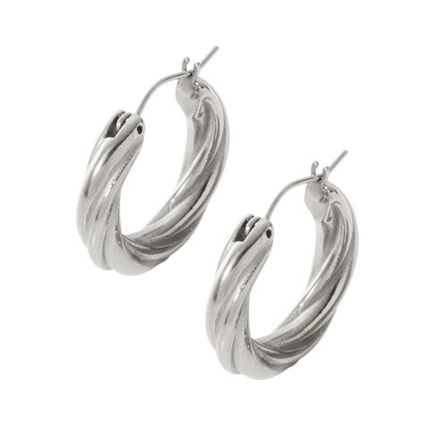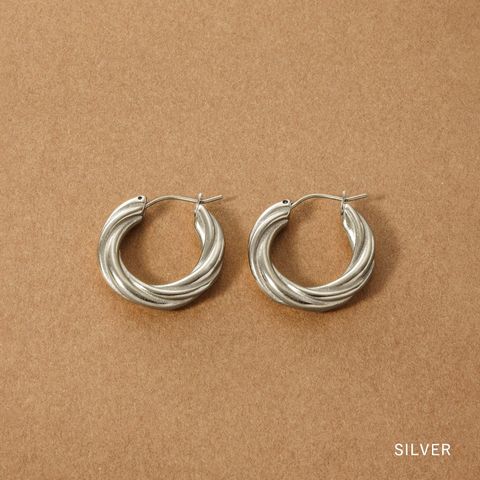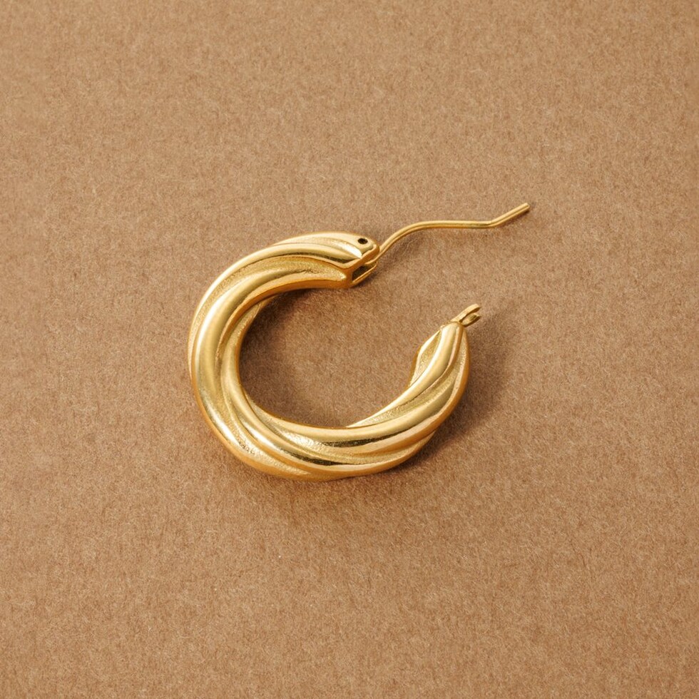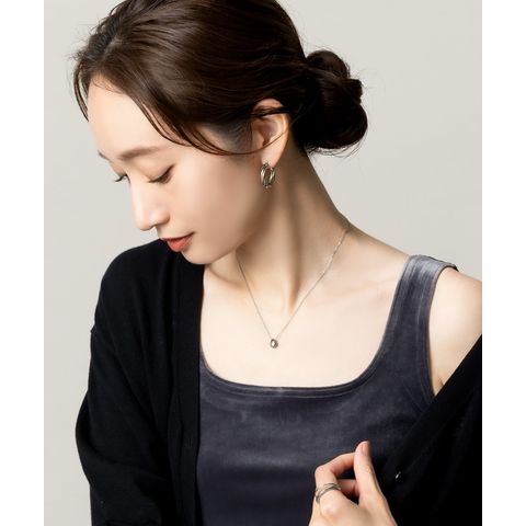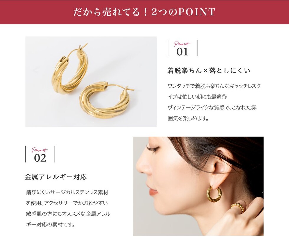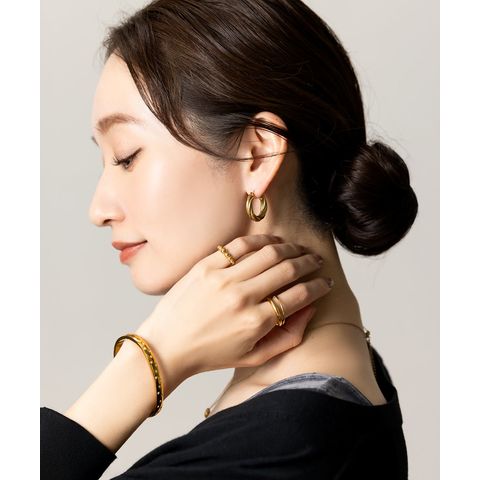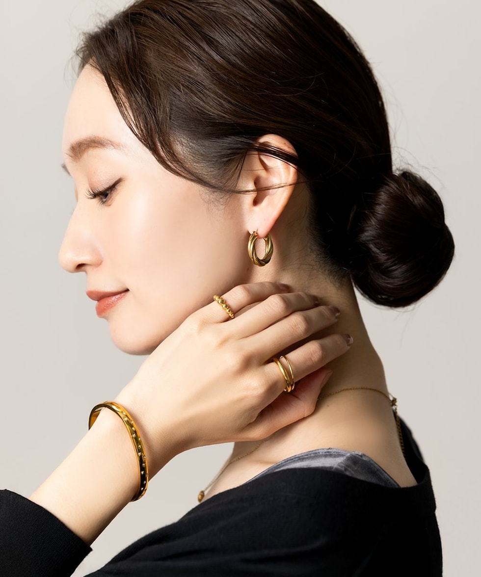 ニュアンス漂うツイストメタルのステンレス製キャッチレスフープピアス。重厚感のあるデザインが大人モードな雰囲気をプラスします。コーデに新鮮さと、目を惹くアクセントを添えるオススメのアイテムです。