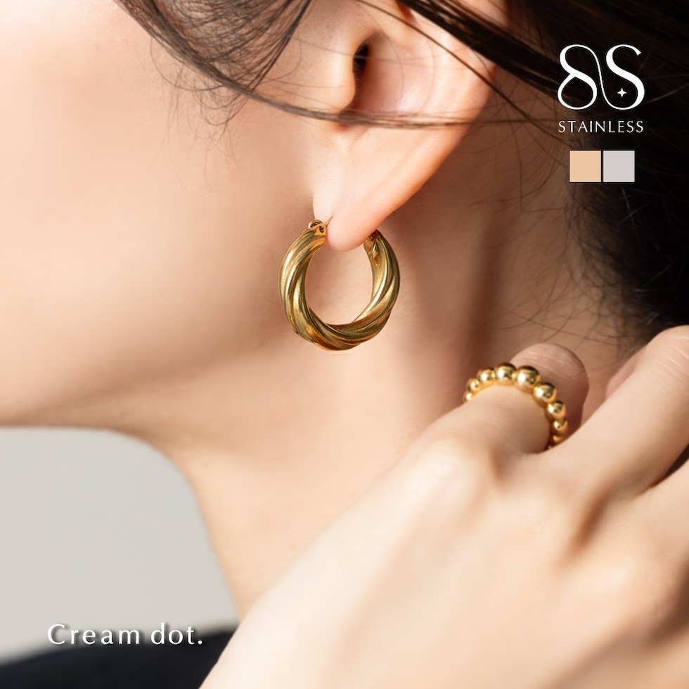 ピアス ステンレス 金属アレルギー サージカルステンレス レディース つけっぱなし キャッチレス 開閉式 ワンタッチ フープ メタル ツイスト ヴィンテージ風 cream dot ゆうパケット [シルバー_ピアス]
