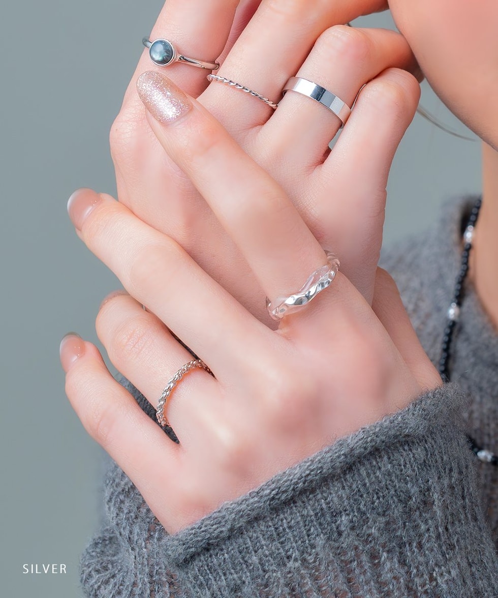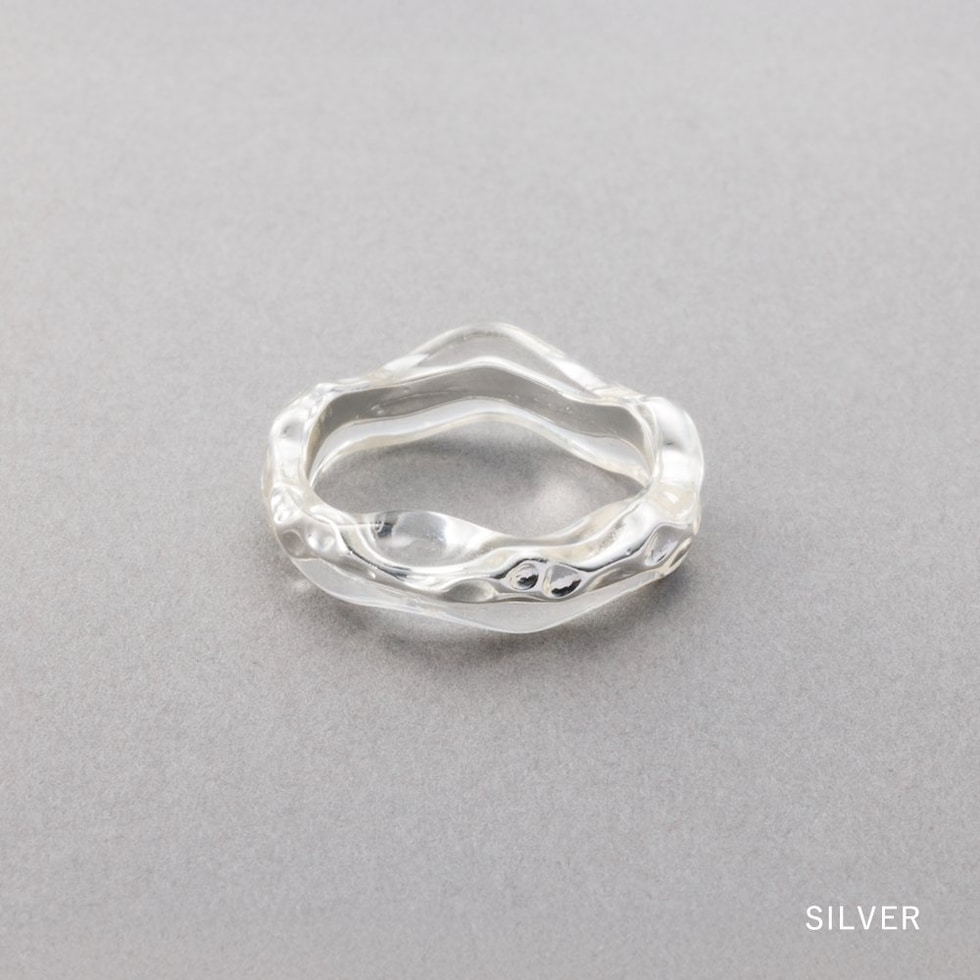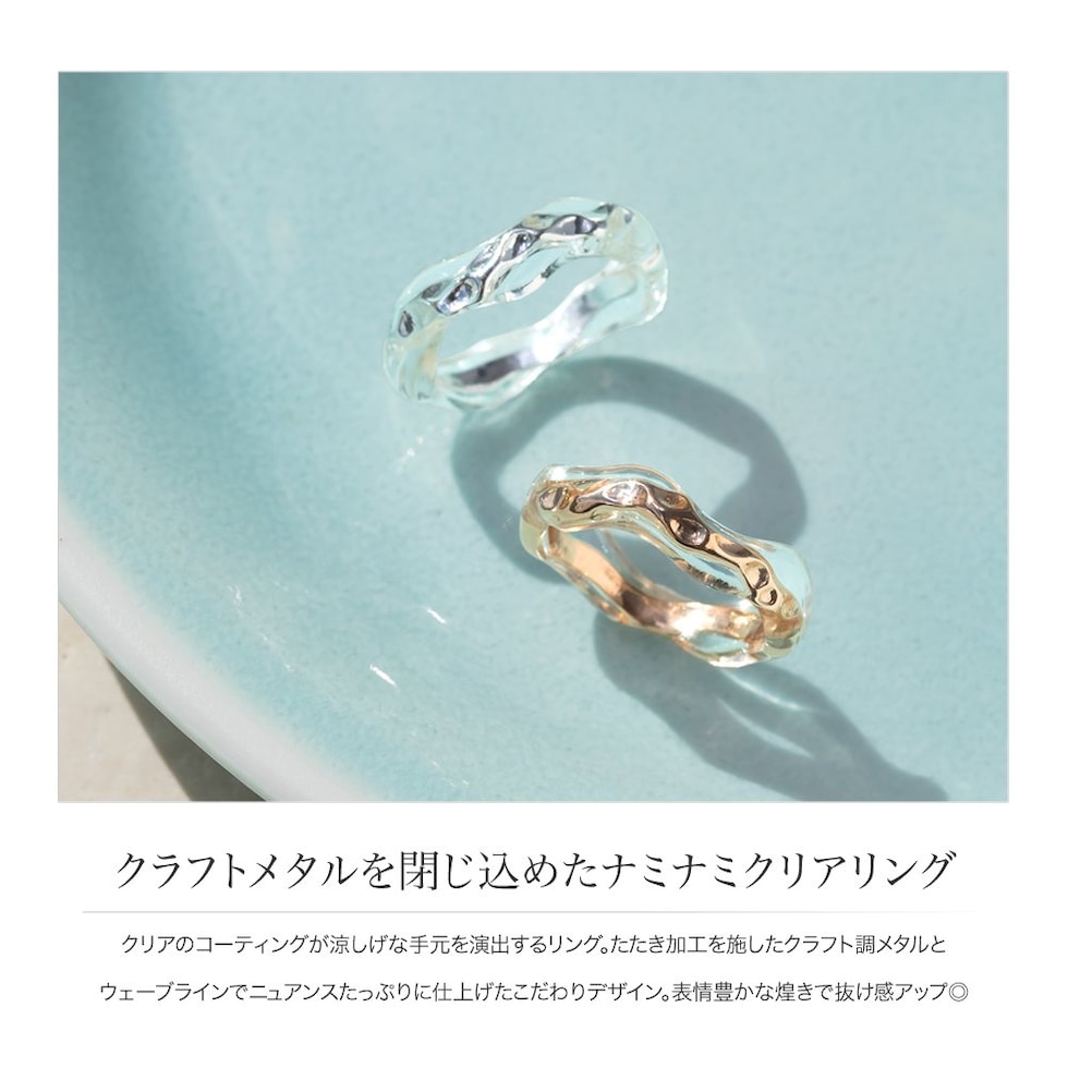 クリアのコーティングが涼しげな手元を演出するリング。たたき加工を施したクラフト調メタルとウェーブラインでニュアンスたっぷりに仕上げたこだわりデザイン。表情豊かな煌きで抜け感アップ◎