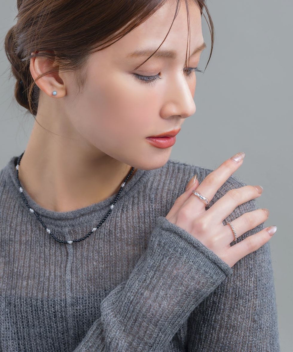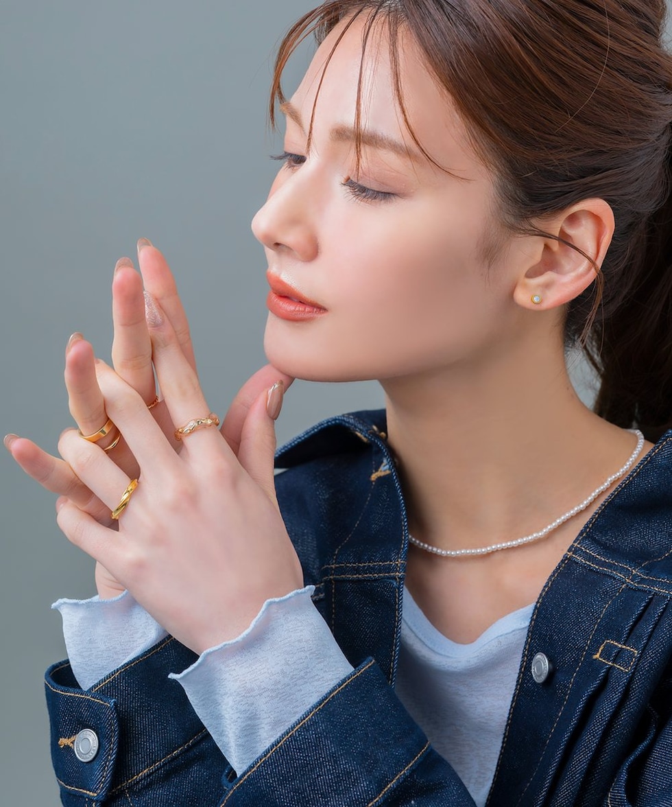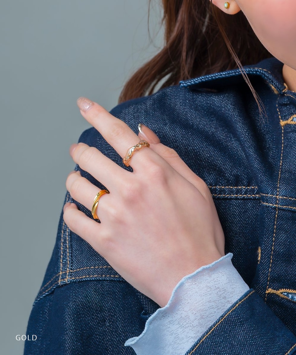 クリアのコーティングが涼しげな手元を演出するリング。たたき加工を施したクラフト調メタルとウェーブラインでニュアンスたっぷりに仕上げたこだわりデザイン。表情豊かな煌きで抜け感アップ◎