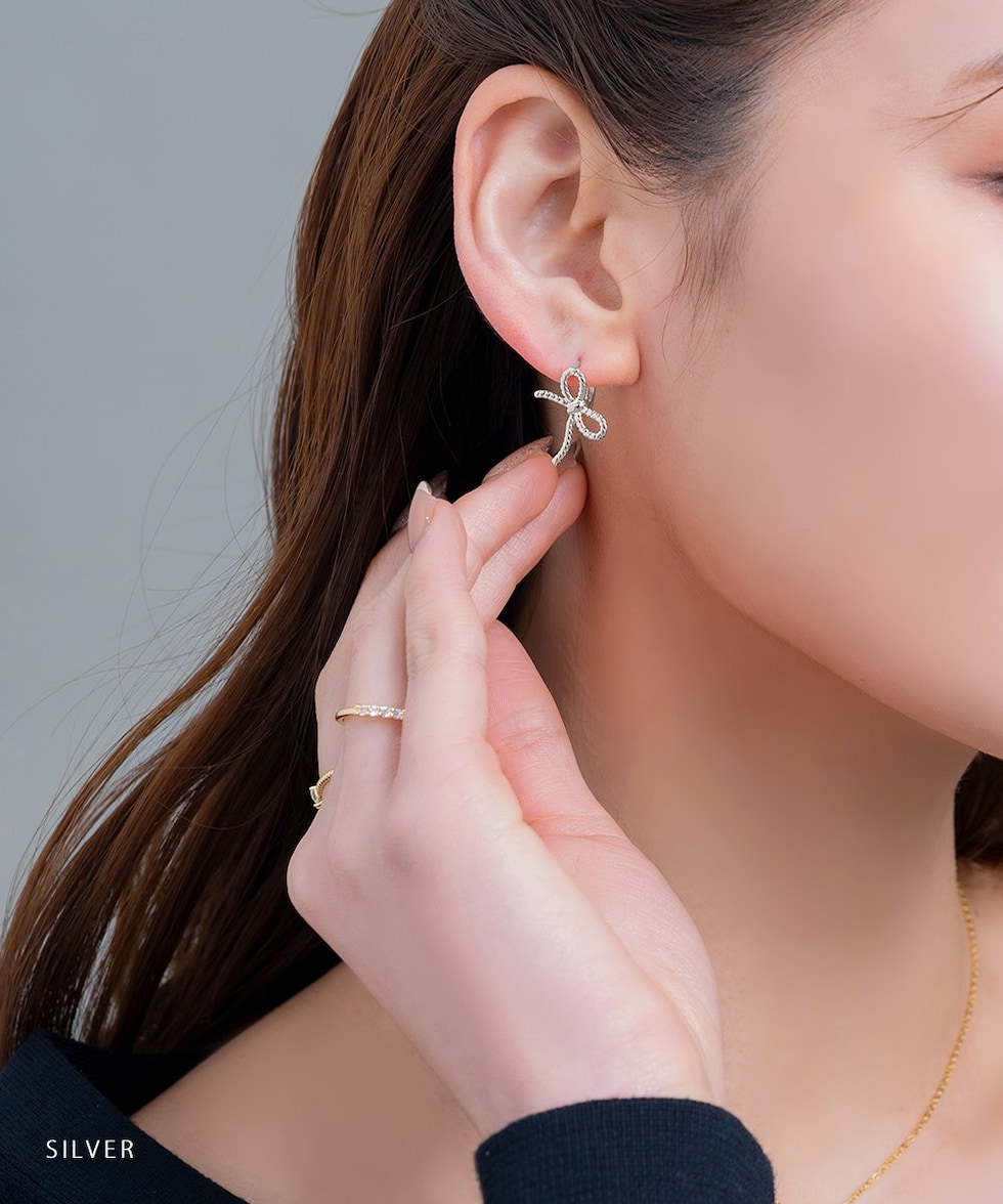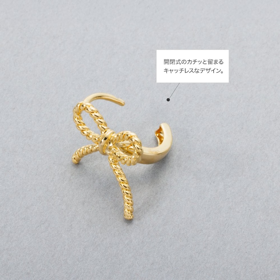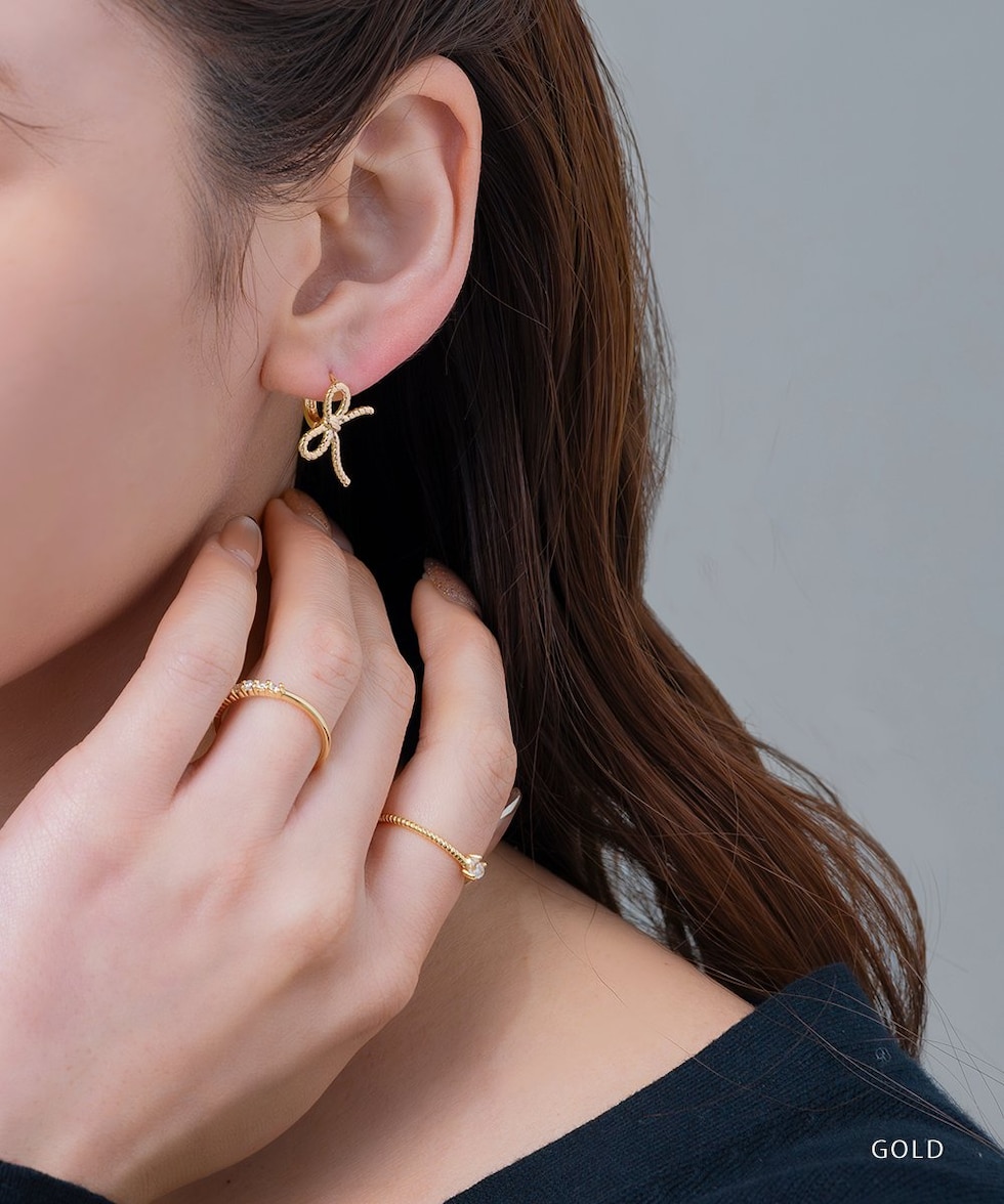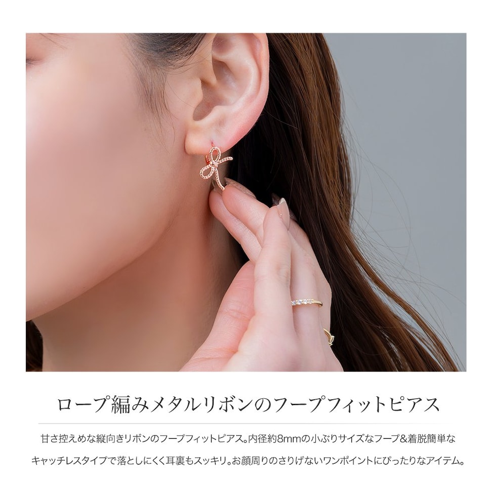 甘さ控えめな縦向きリボンのフープフィットピアス。内径約8mmの小ぶりサイズなフープ&着脱簡単なキャッチレスタイプで落としにくく耳裏もスッキリ。お顔周りのさりげないワンポイントにぴったりなアイテム。