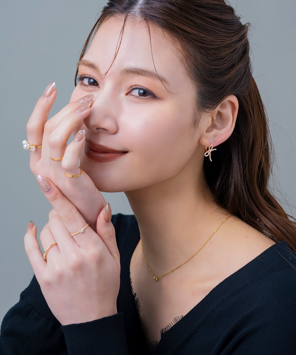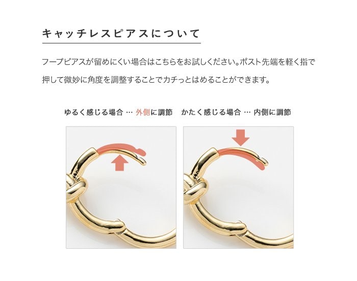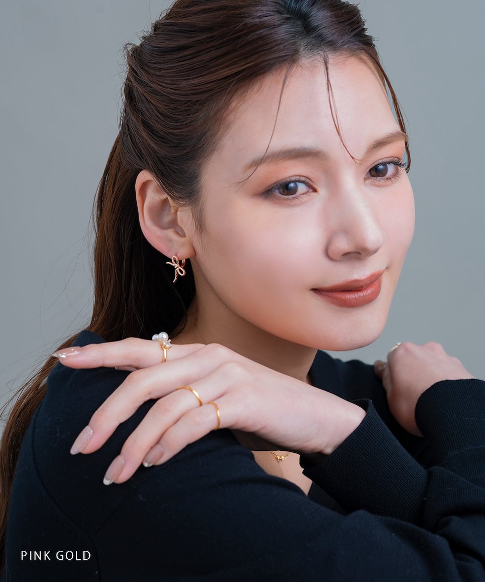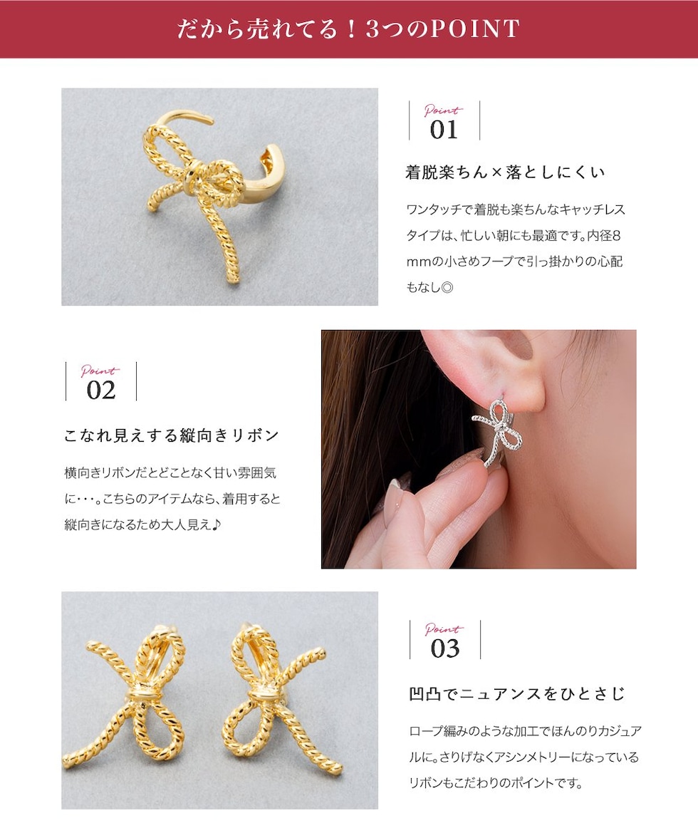 甘さ控えめな縦向きリボンのフープフィットピアス。内径約8mmの小ぶりサイズなフープ&着脱簡単なキャッチレスタイプで落としにくく耳裏もスッキリ。お顔周りのさりげないワンポイントにぴったりなアイテム。
