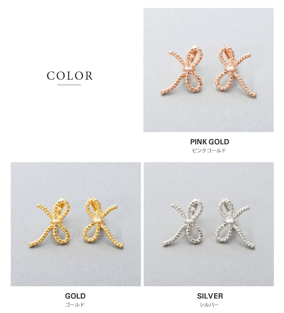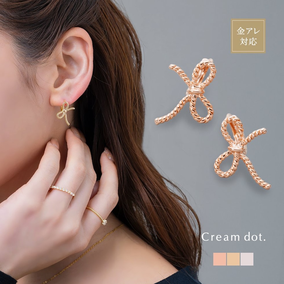 ピアス 金属アレルギー ニッケルフリー レディース キャッチレス 中折れ ワンタッチ フープ 縦向き リボン ロープ編み アシンメトリー 耳たぶフィット フィット cream dot ゆうパケット [ピンクゴールド_ピアス]