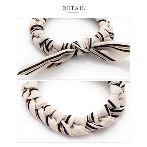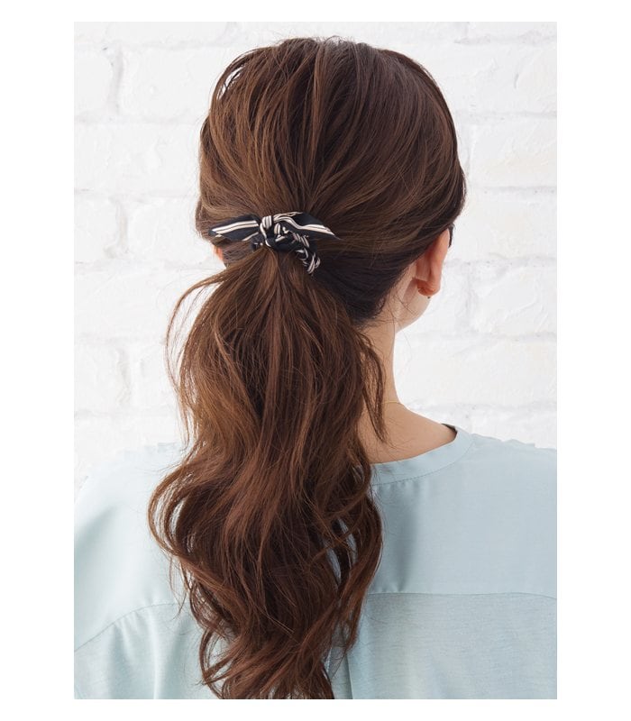 ストライプ生地のリボンを編み込んだキュートなヘアゴム。