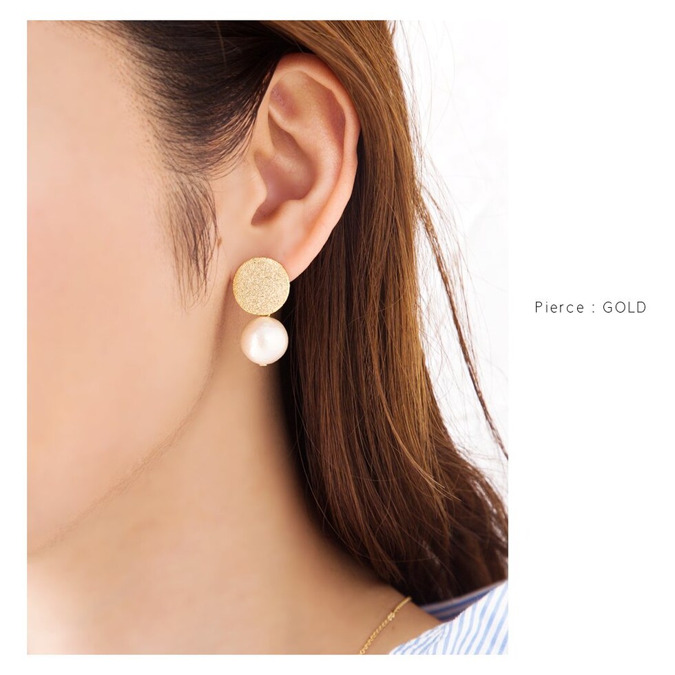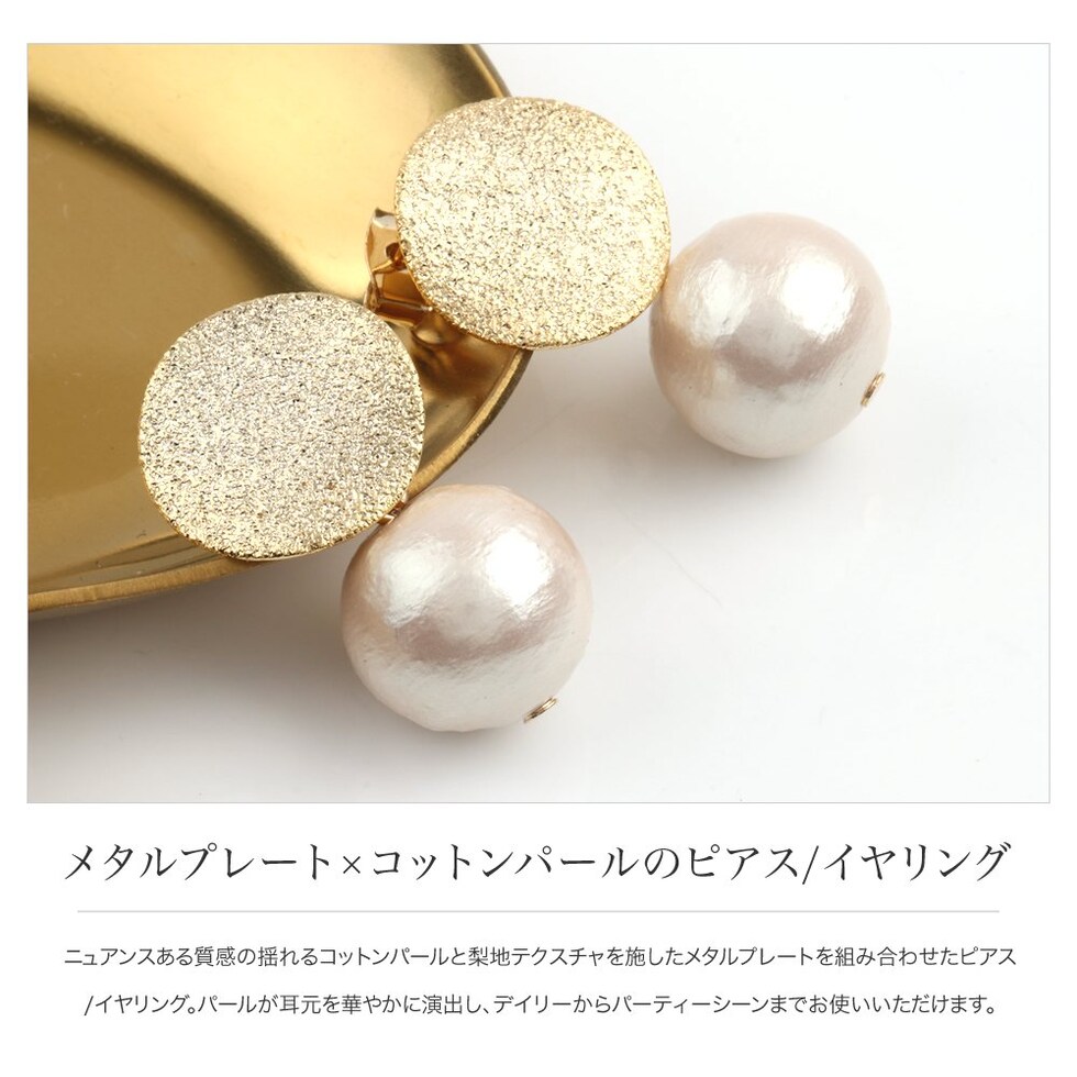 ニュアンスある質感の揺れるコットンパールと梨地テクスチャを施したメタルプレートを組み合わせたピアス/イヤリング。