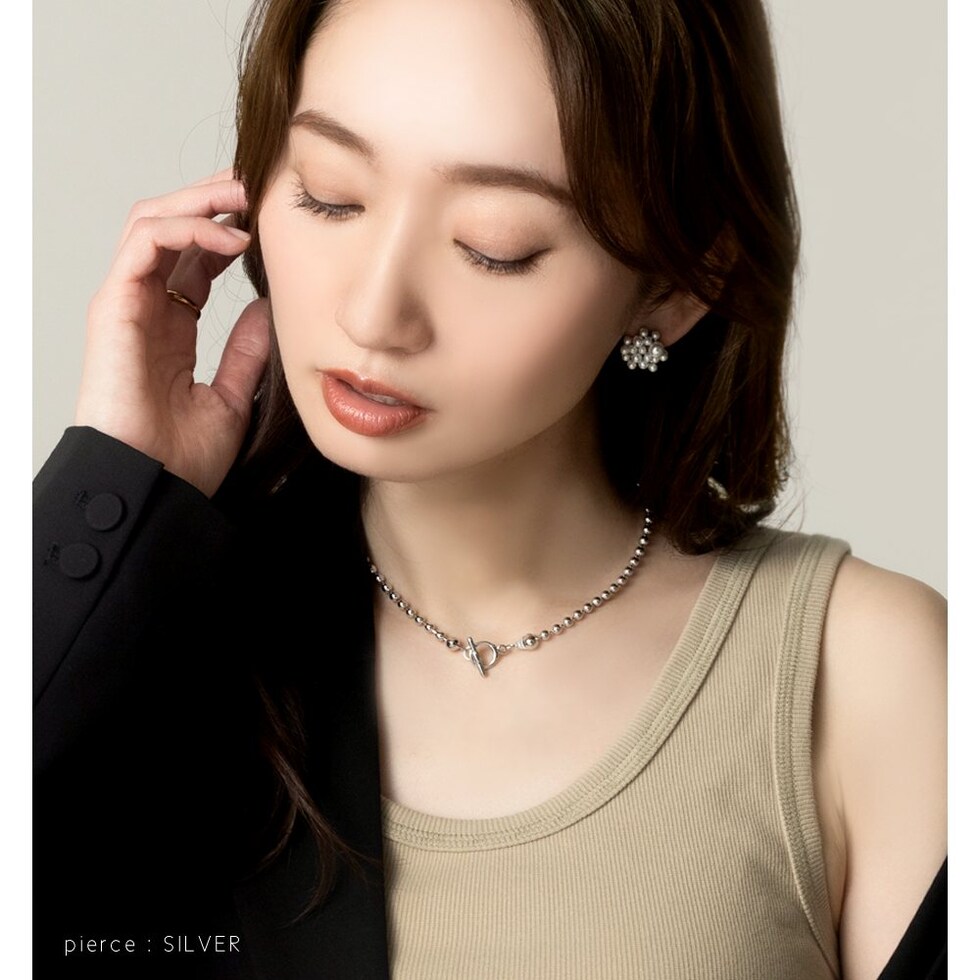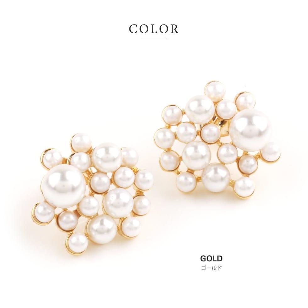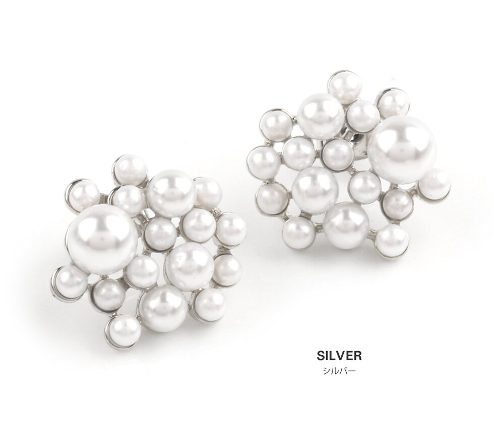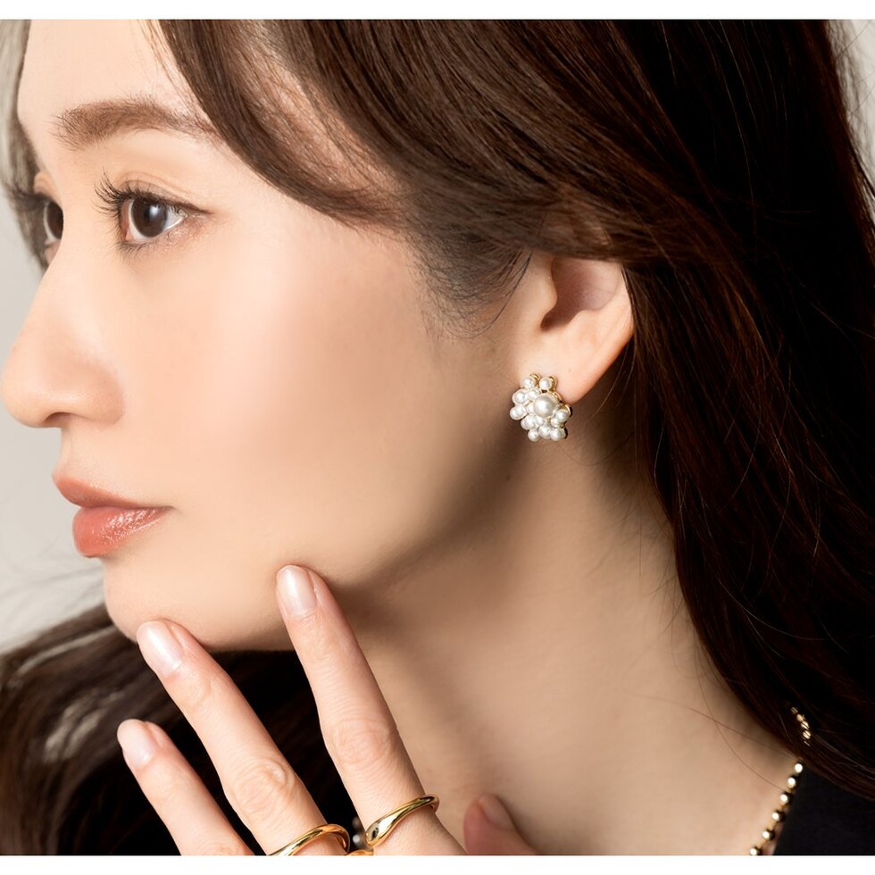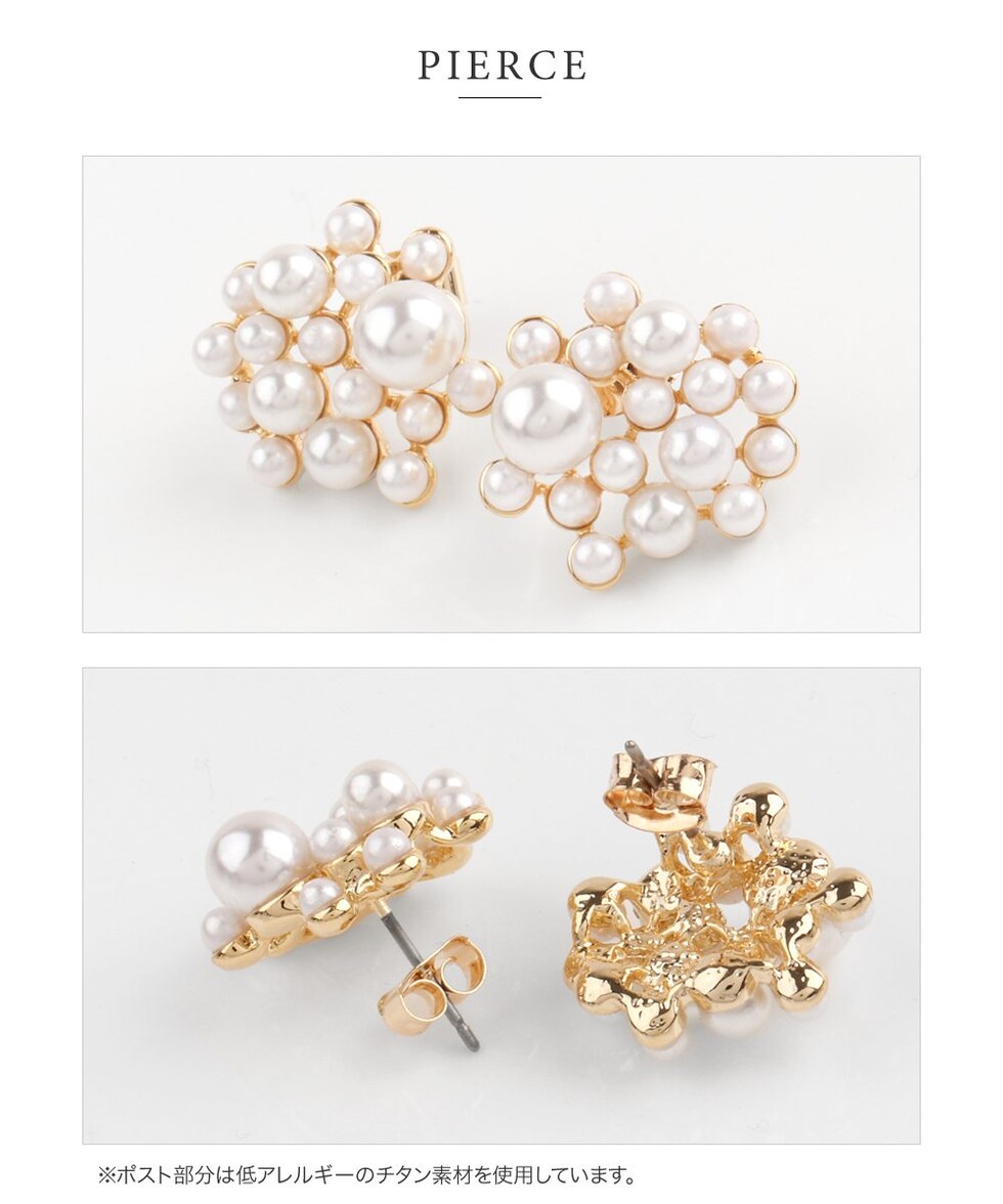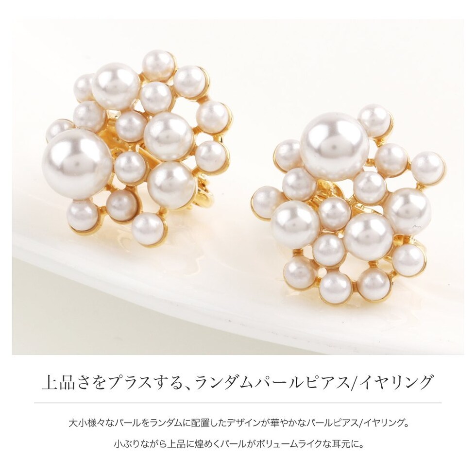 大小様々なパールをランダムに配置したデザインが華やかなパールピアス/イヤリング。小ぶりながら上品に煌めくパールがボリュームライクな耳元に。