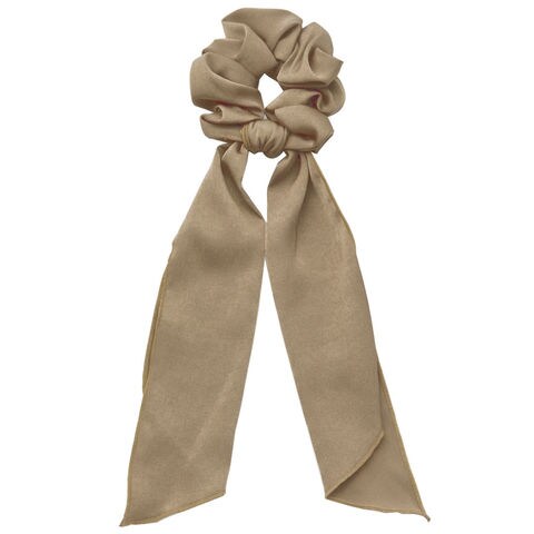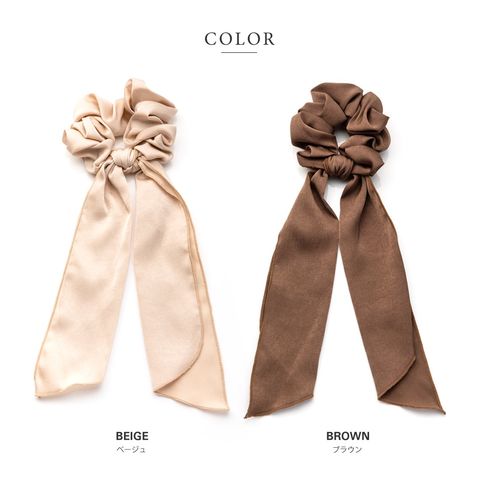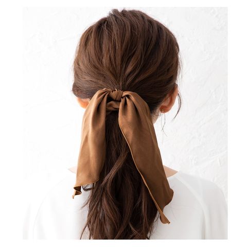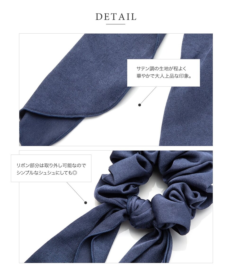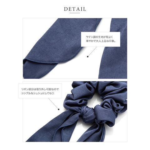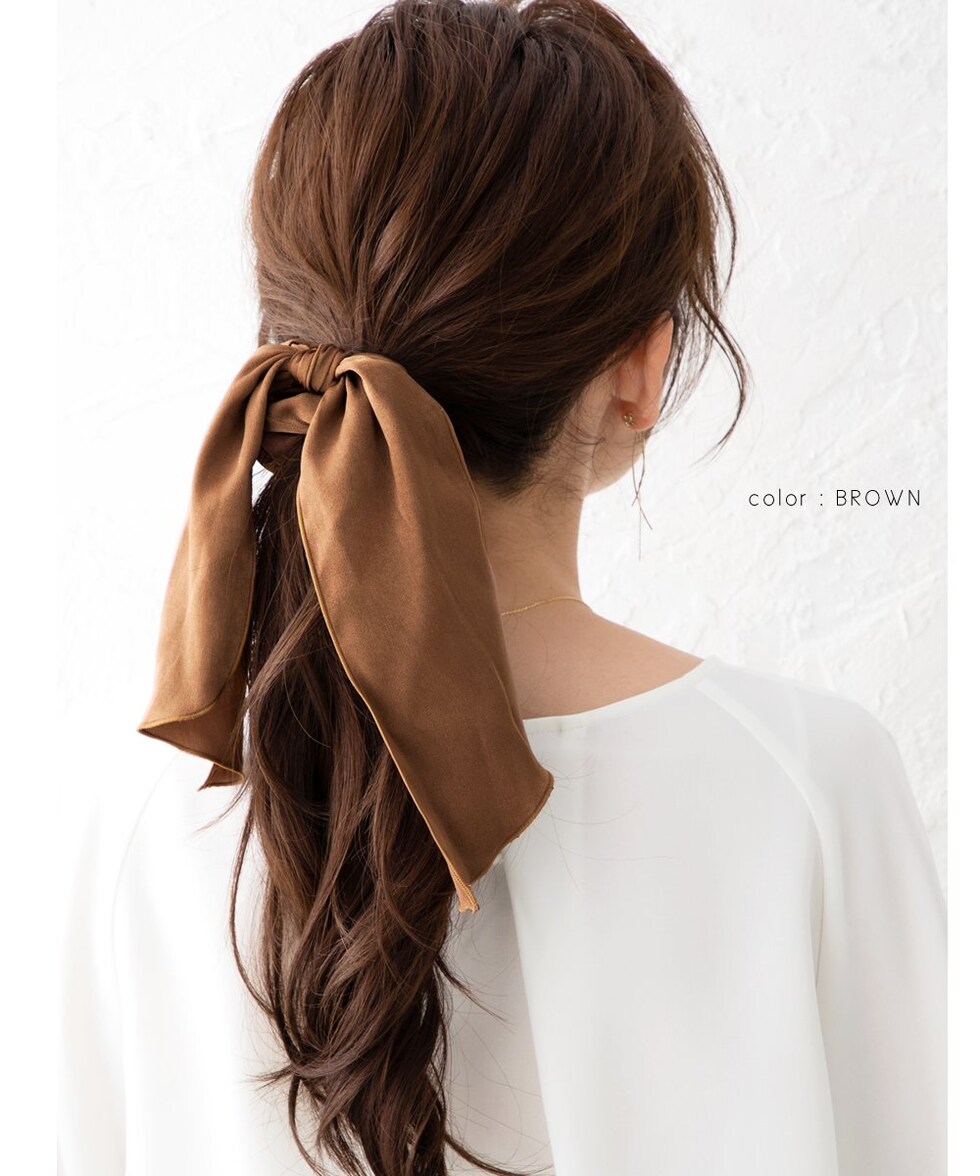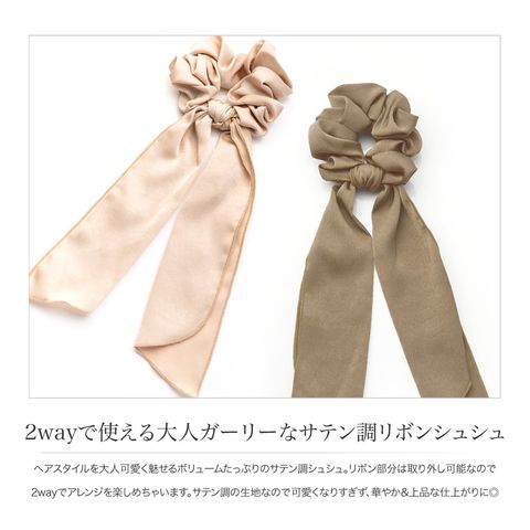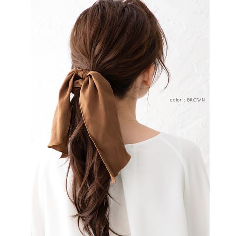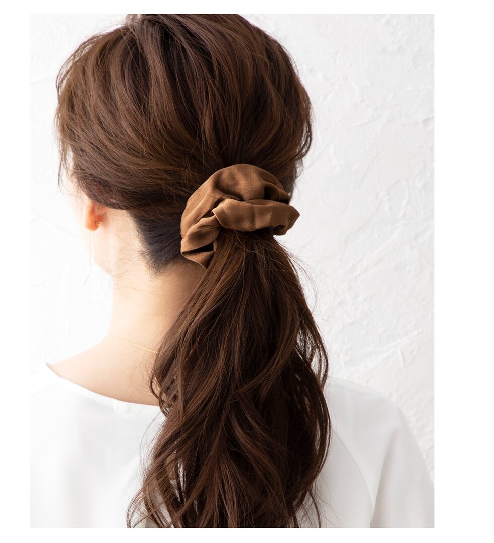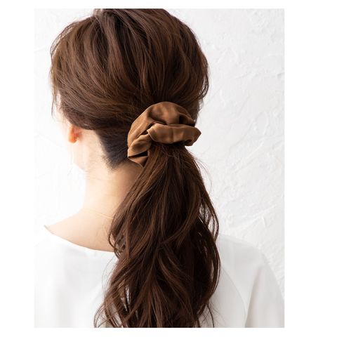 ヘアスタイルを大人可愛く魅せるボリュームたっぷりのサテン調シュシュ。