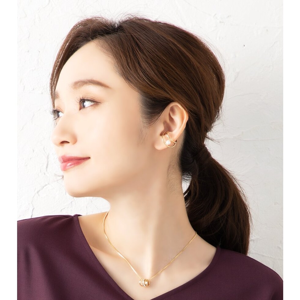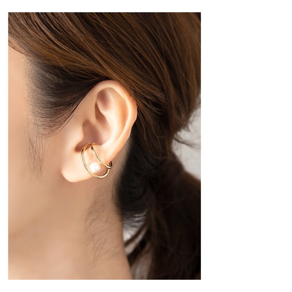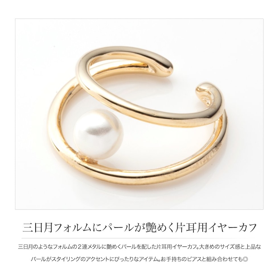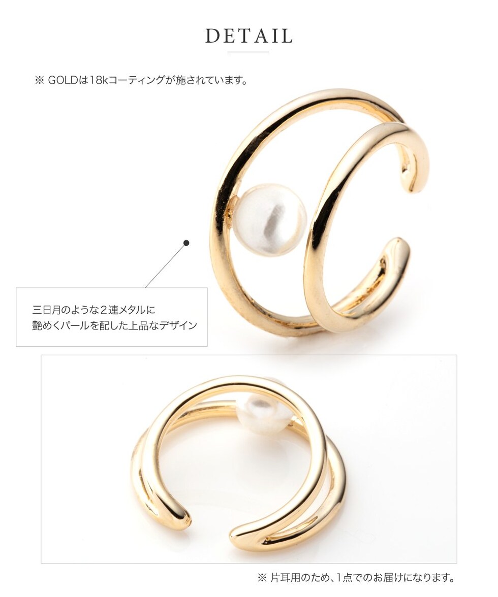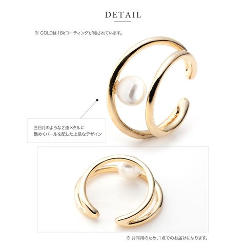 三日月のようなフォルムの2連メタルに艶めくパールを配した片耳用イヤーカフ。
