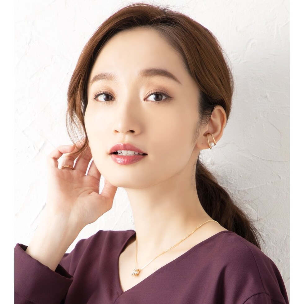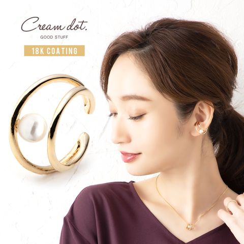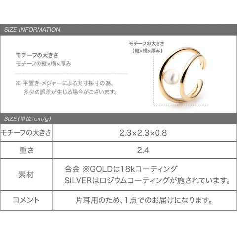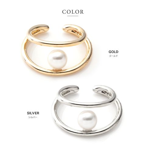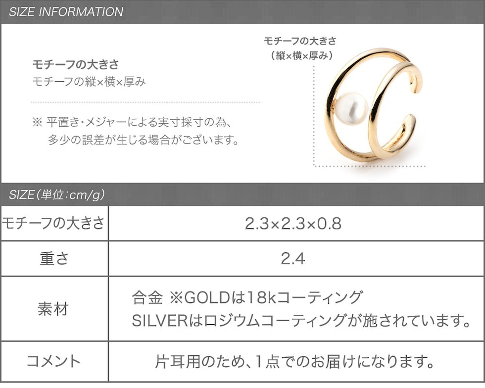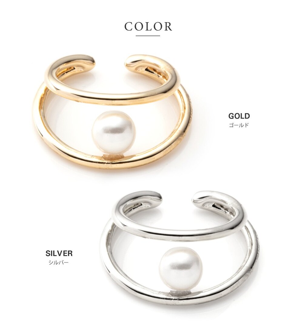 三日月のようなフォルムの2連メタルに艶めくパールを配した片耳用イヤーカフ。