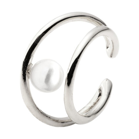 三日月のようなフォルムの2連メタルに艶めくパールを配した片耳用イヤーカフ。
