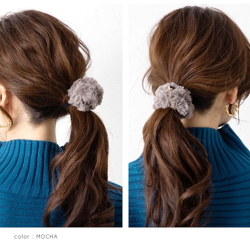 シュシュのように使ったり、ヘアゴム部分を引き伸ばしてファーボール風にしたりと、気分やコーデによって違う雰囲気が楽しめます◎