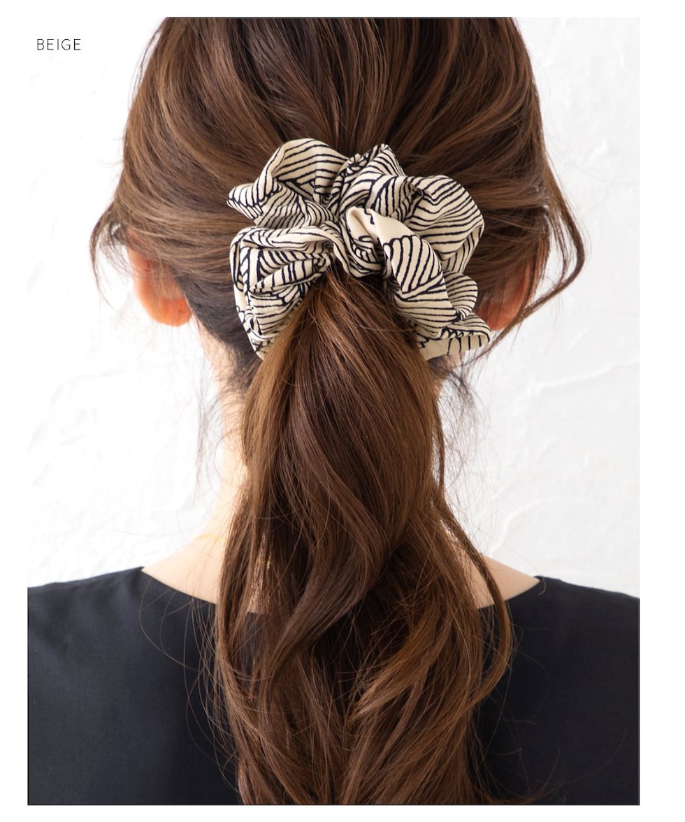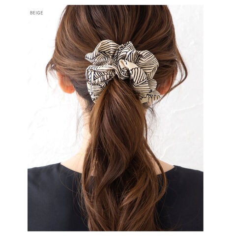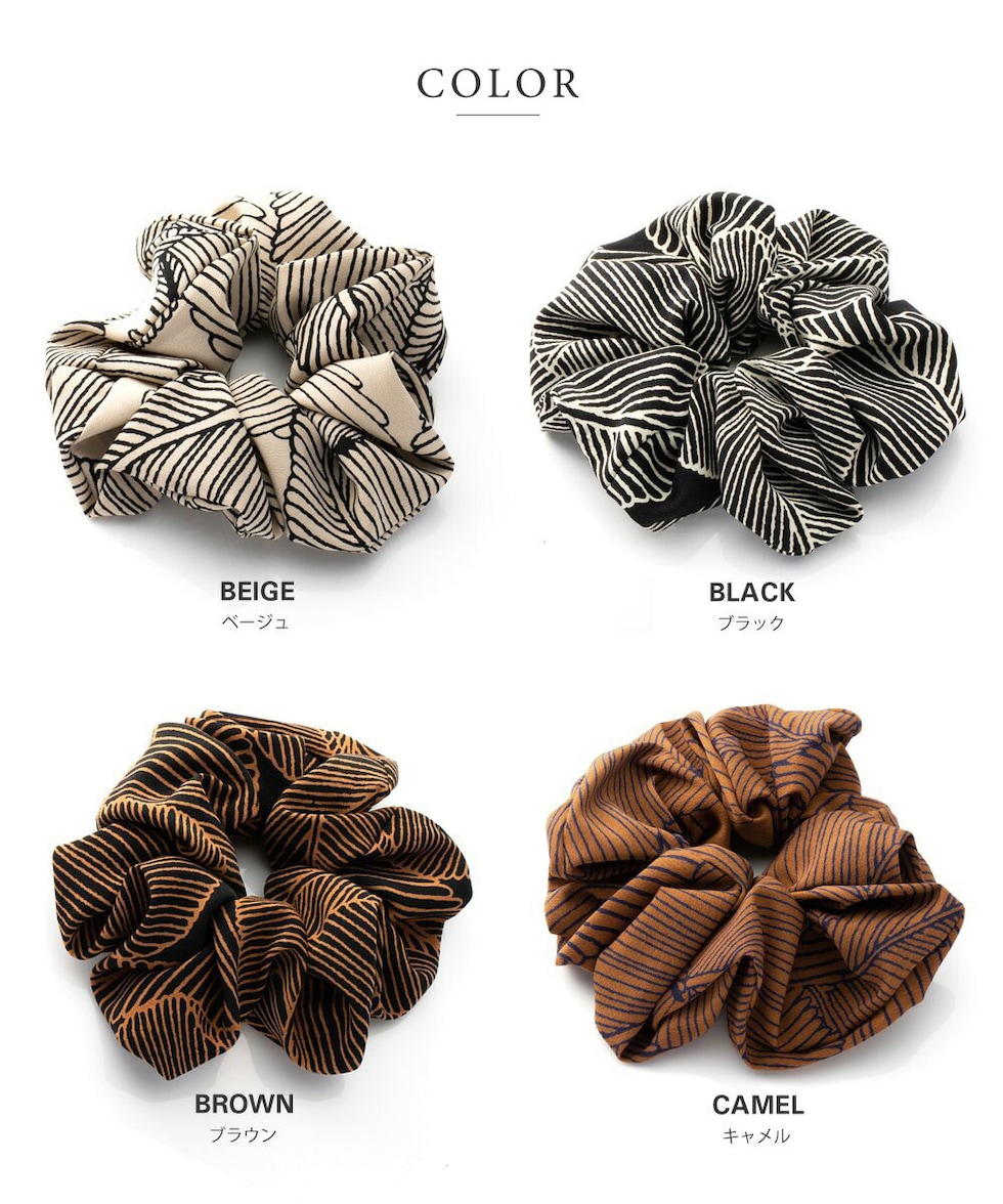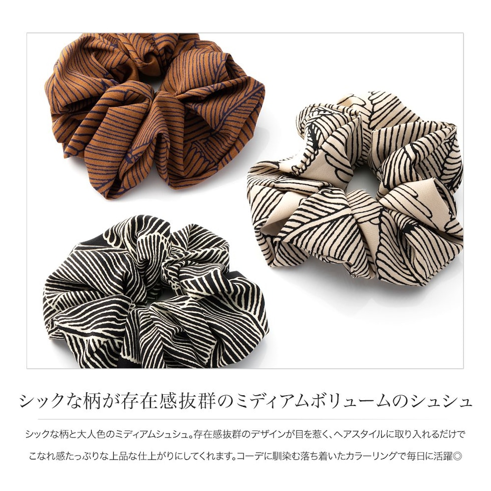 シックな柄と大人色のミディアムシュシュ。存在感抜群のデザインが目を惹く、ヘアスタイルに取り入れるだけでこなれ感たっぷりな上品な仕上がりにしてくれます。コーデに馴染む落ち着いたカラーリングで毎日に活躍◎