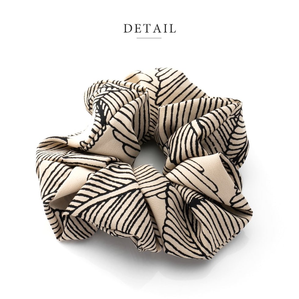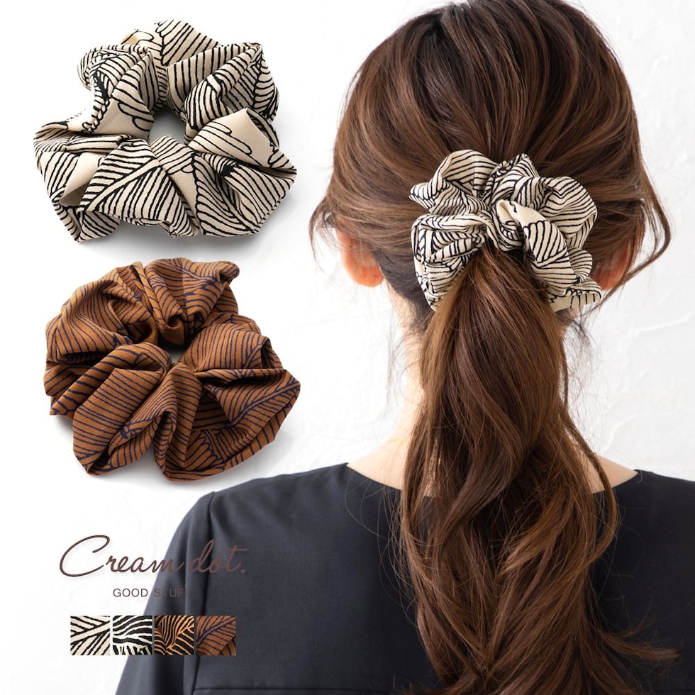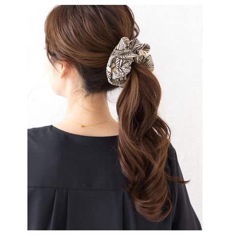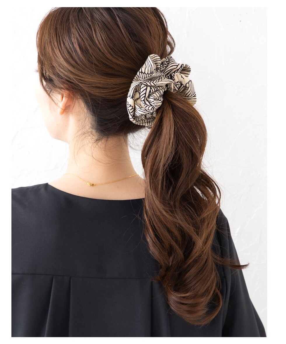 シックな柄と大人色のミディアムシュシュ。存在感抜群のデザインが目を惹く、ヘアスタイルに取り入れるだけでこなれ感たっぷりな上品な仕上がりにしてくれます。コーデに馴染む落ち着いたカラーリングで毎日に活躍◎