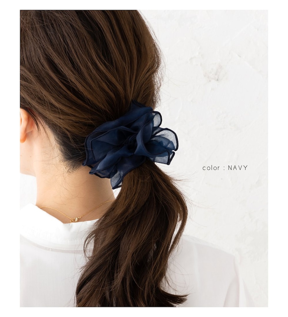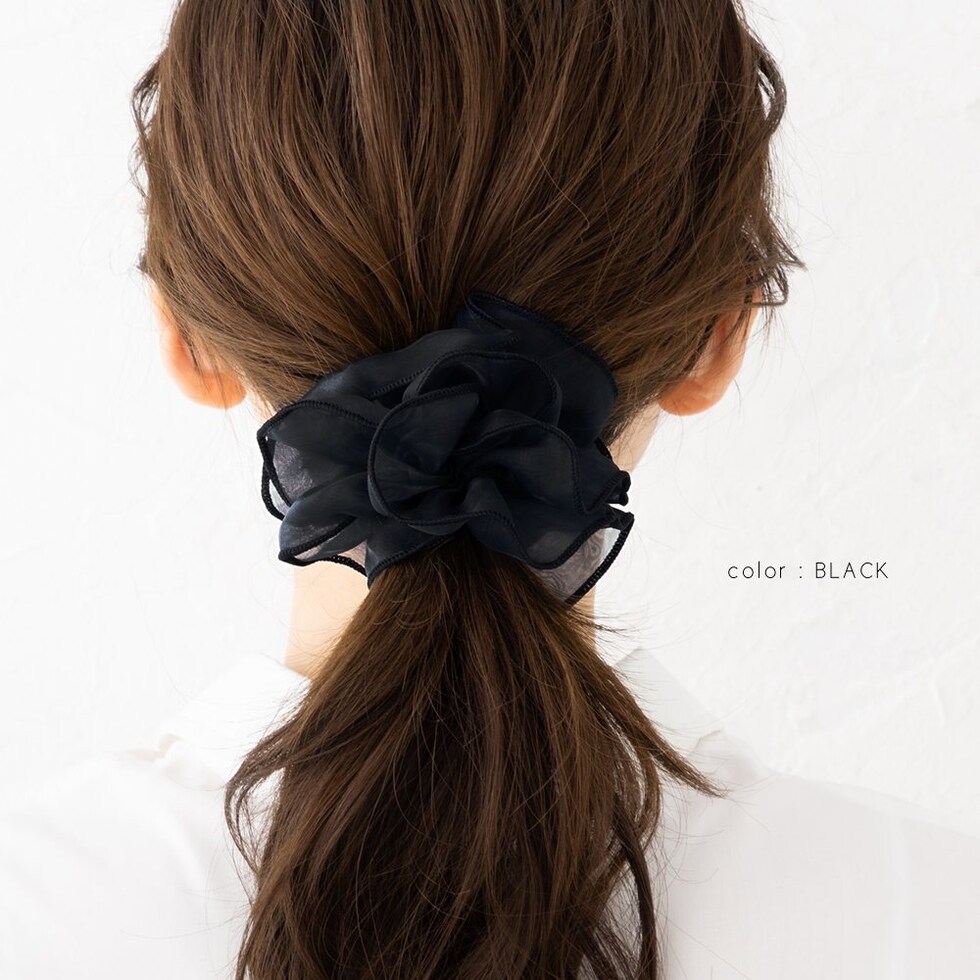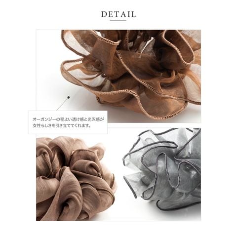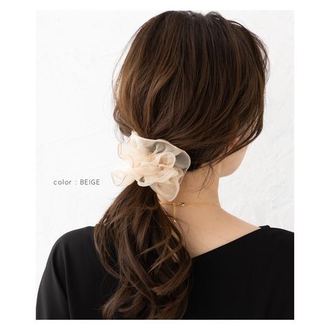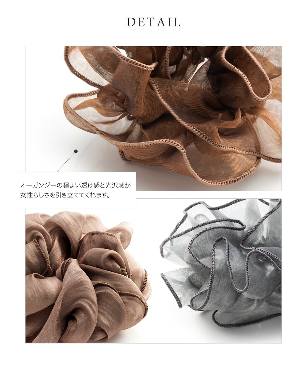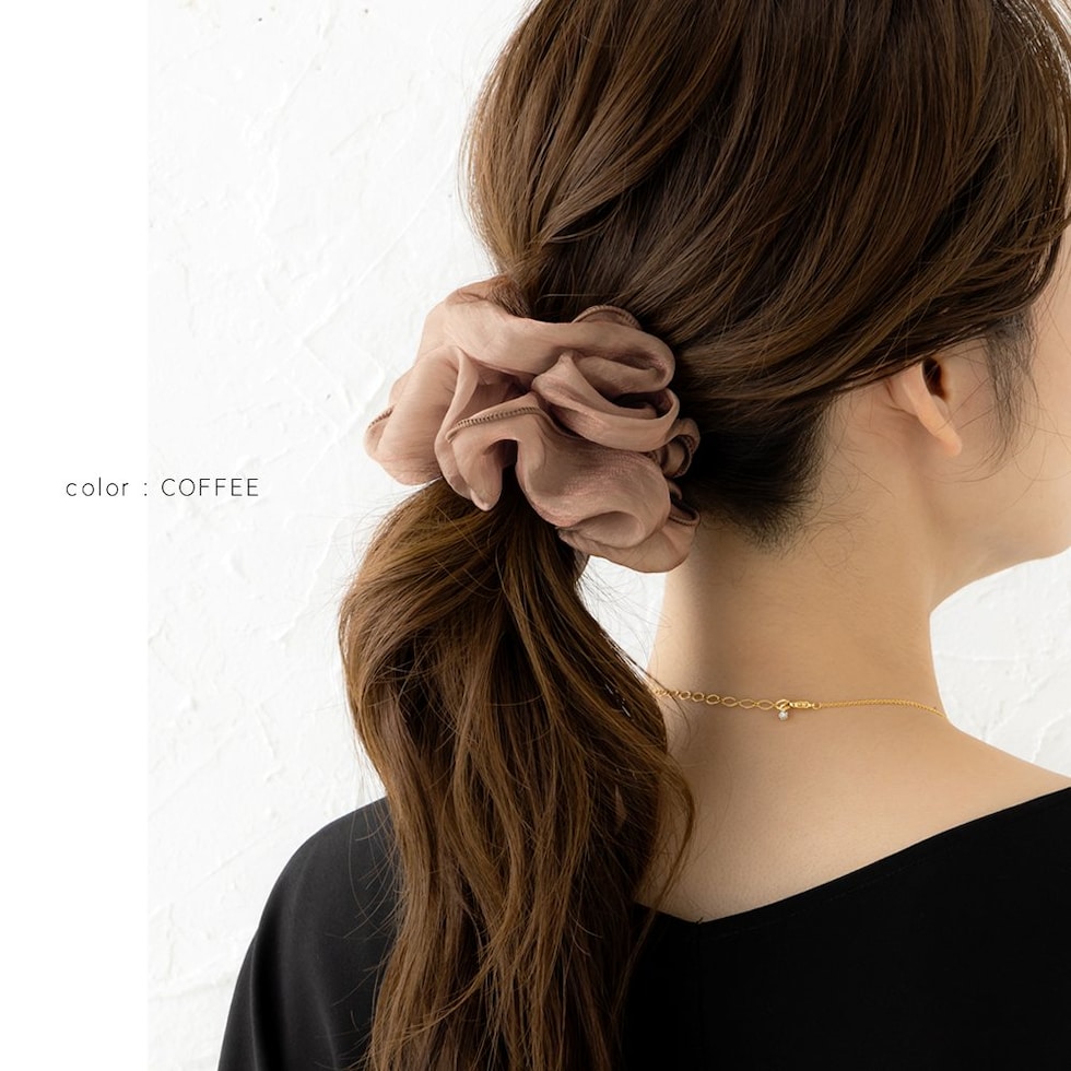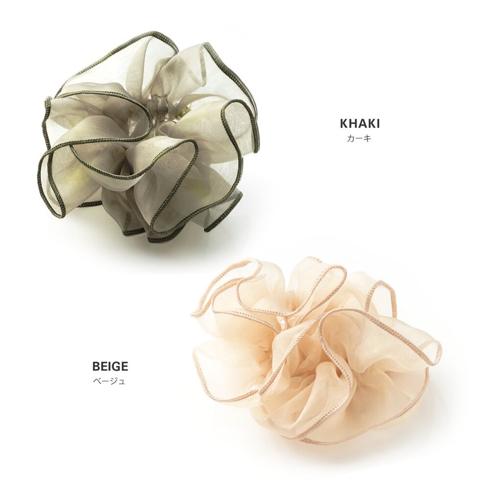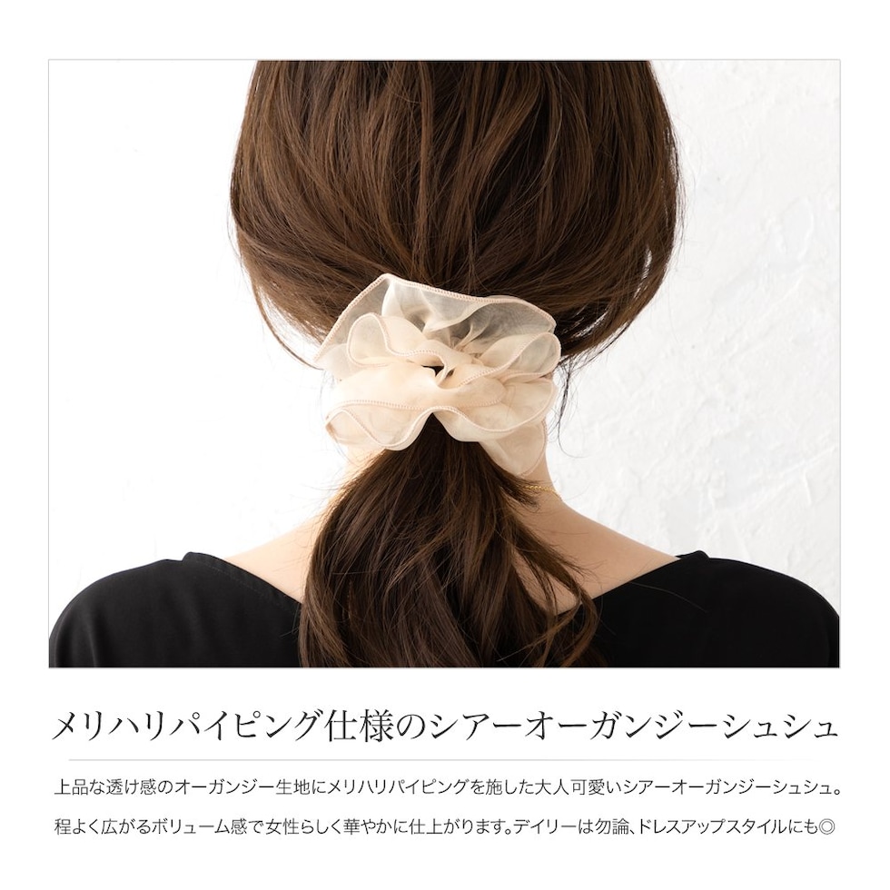 上品な透け感のオーガンジー生地にメリハリパイピングを施した大人可愛いシアーオーガンジーシュシュ。程よく広がるボリューム感で女性らしく華やかに仕上がります。デイリーは勿論、ドレスアップスタイルにも◎