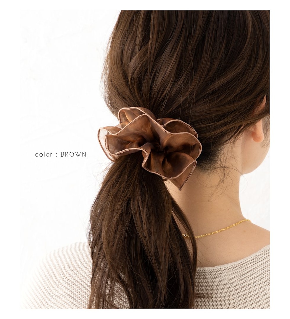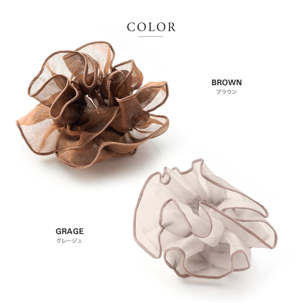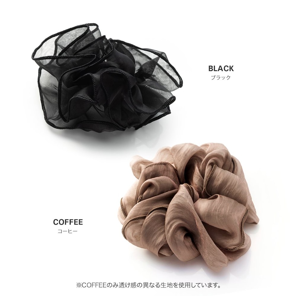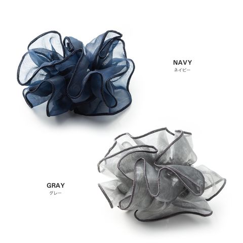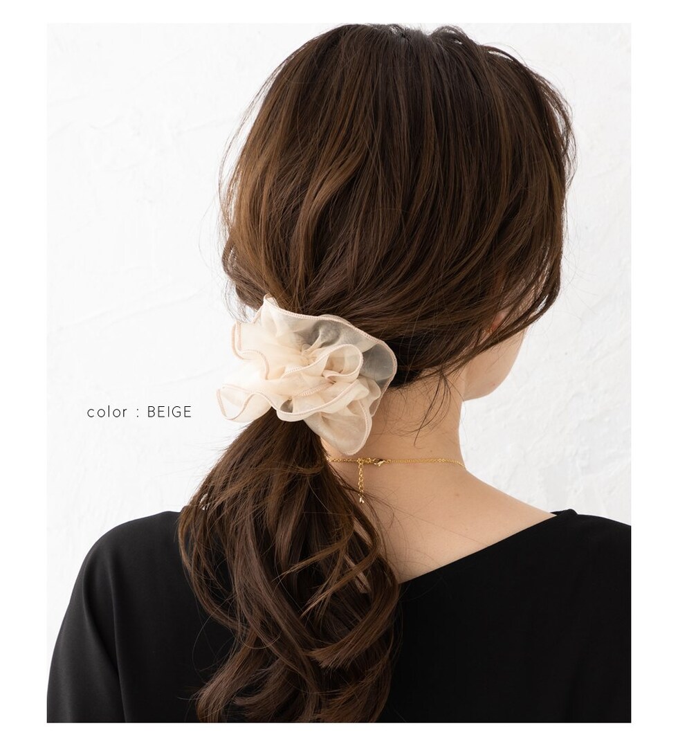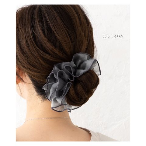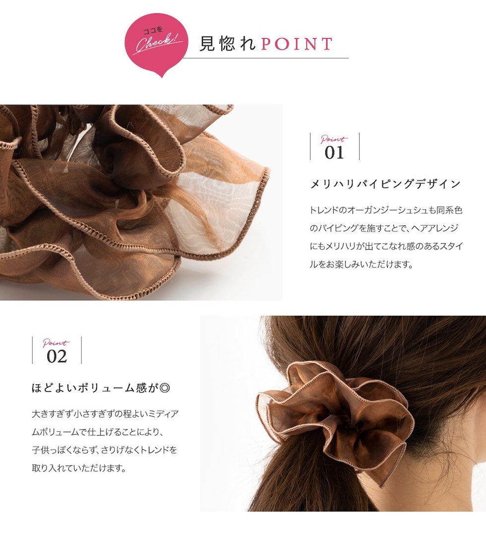 上品な透け感のオーガンジー生地にメリハリパイピングを施した大人可愛いシアーオーガンジーシュシュ。程よく広がるボリューム感で女性らしく華やかに仕上がります。デイリーは勿論、ドレスアップスタイルにも◎