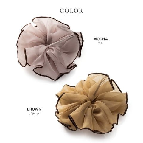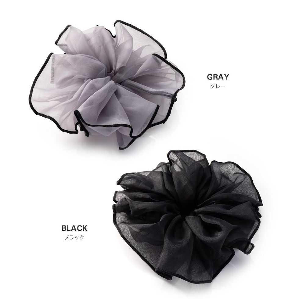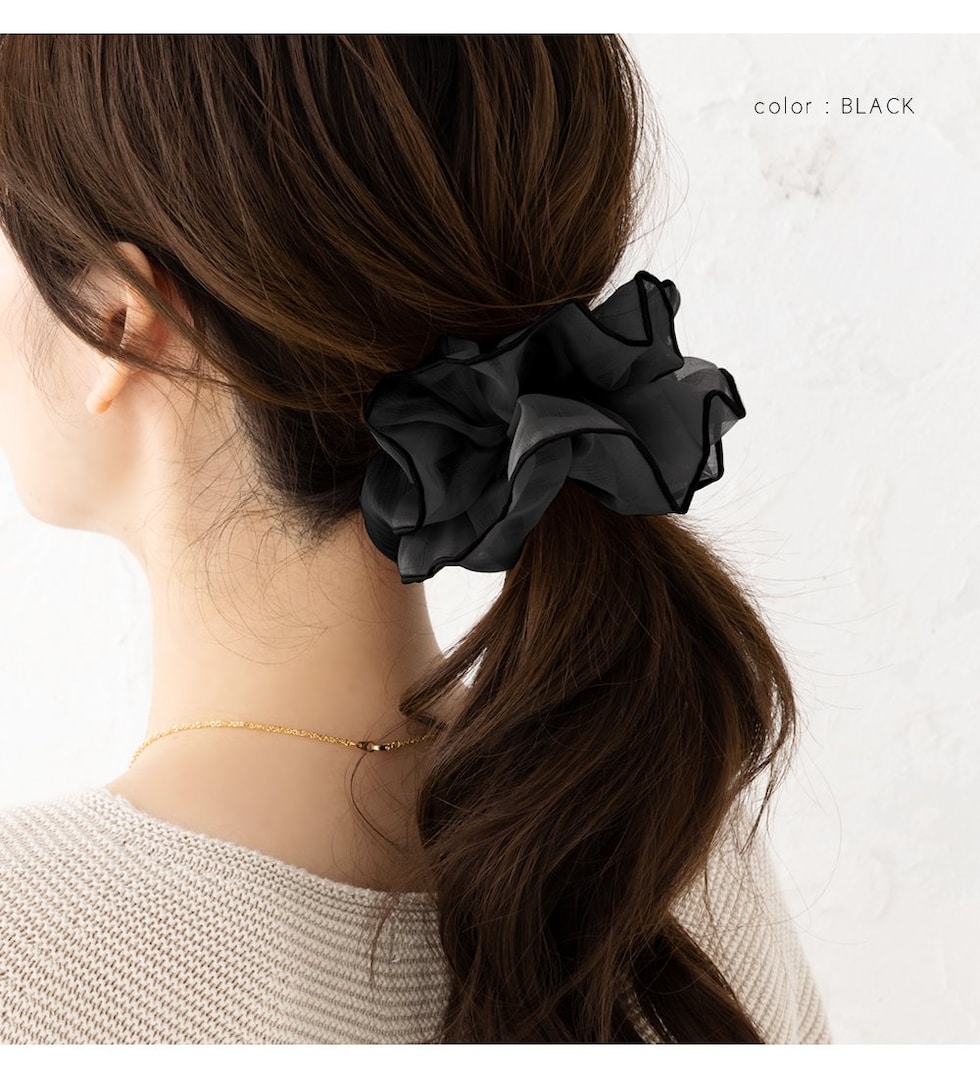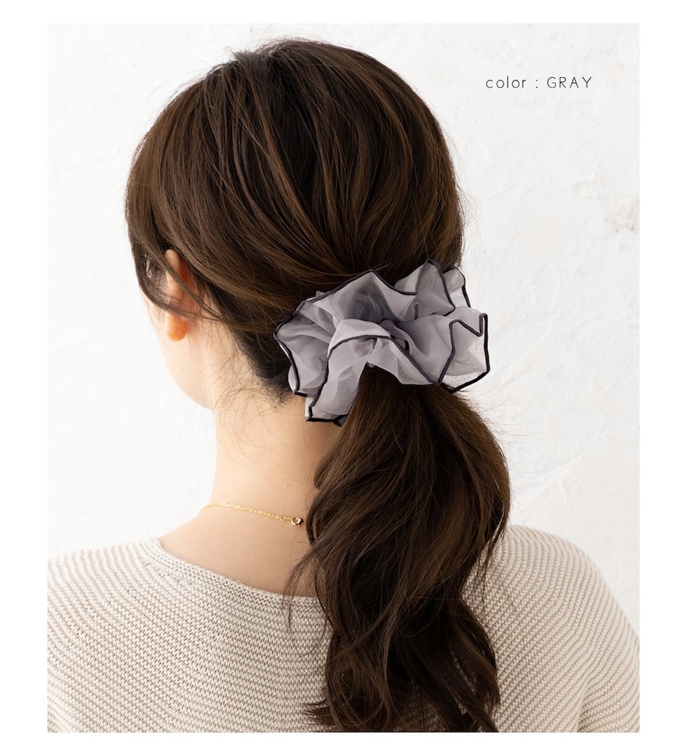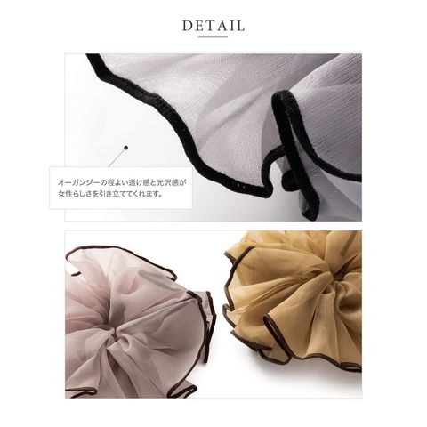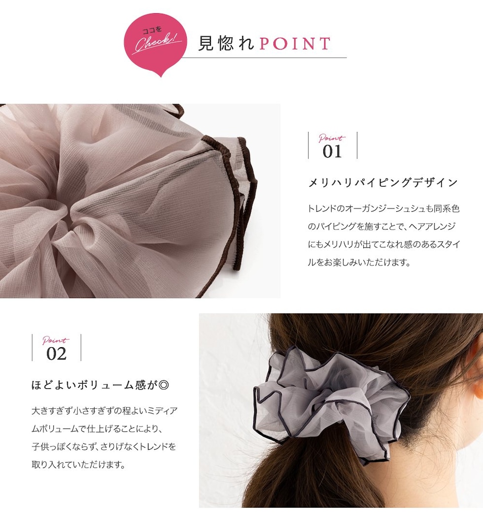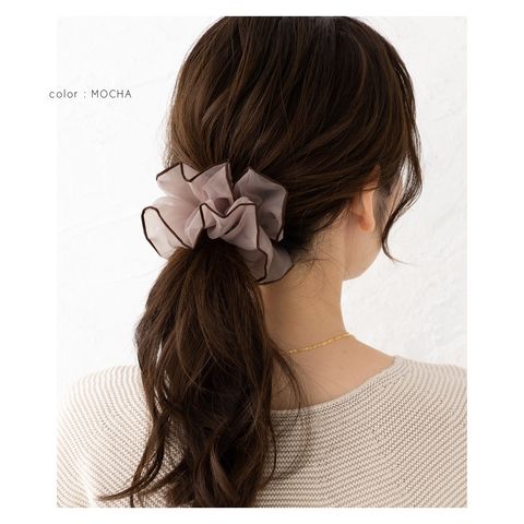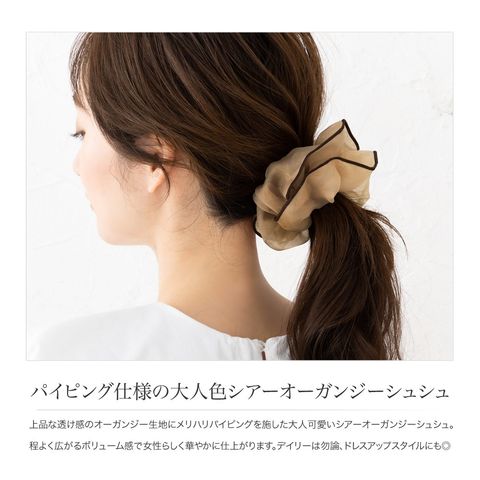 上品な透け感のオーガンジー生地にメリハリパイピングを施した大人可愛いシアーオーガンジーシュシュ。程よく広がるボリューム感で女性らしく華やかに仕上がります。デイリーは勿論、ドレスアップスタイルにも◎