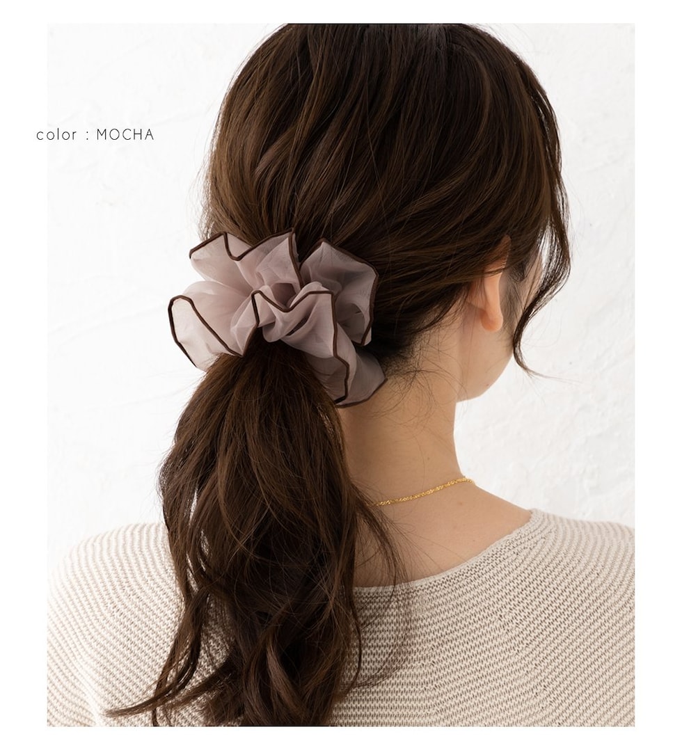 トレンドのオーガンジーシュシュも同系色のパイピングを施すことで、ヘアアレンジにもメリハリが出てこなれ感のあるスタイルをお楽しみいただけます。
