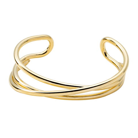 3本のラインがクロスしたようなデザイン性のあるワイドバングル。艶のあるメタルラインと立体的なシルエットが大人の抜け感を演出。いつものコーデにプラスするだけで洗練された印象に引き上げてくれるアイテムです。