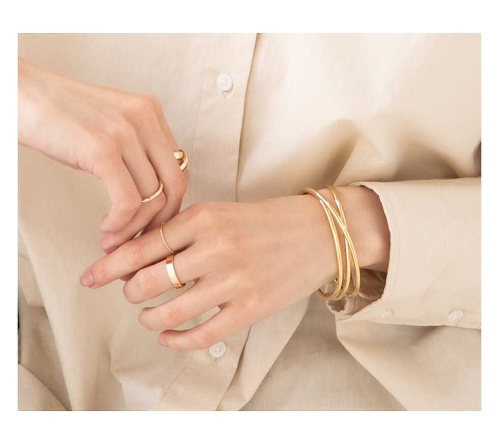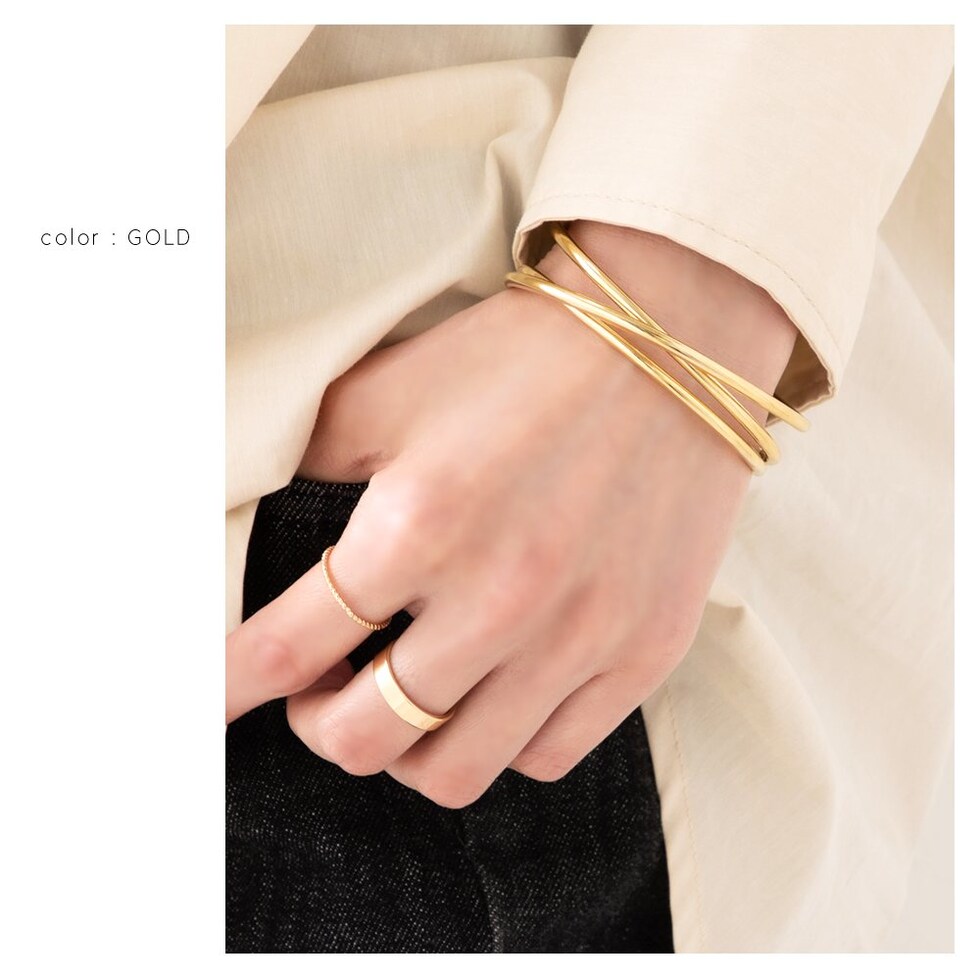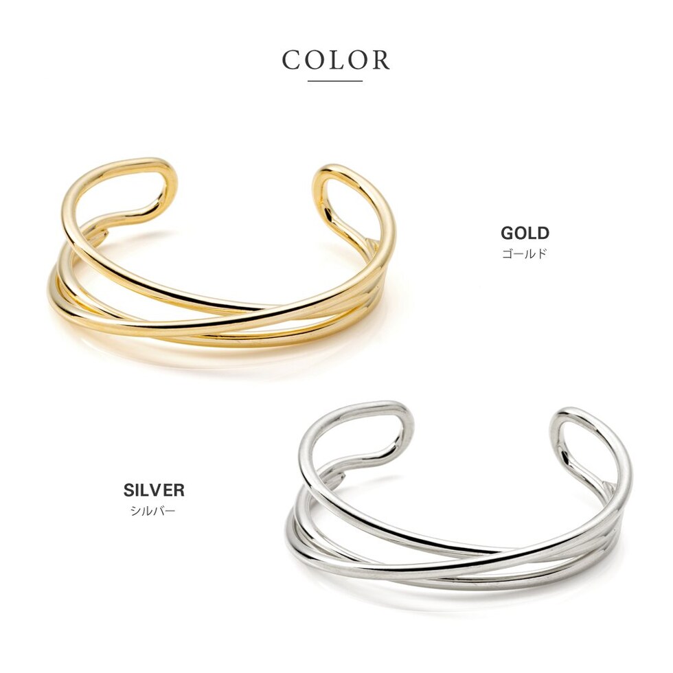 3本のラインがクロスしたようなデザイン性のあるワイドバングル。艶のあるメタルラインと立体的なシルエットが大人の抜け感を演出。いつものコーデにプラスするだけで洗練された印象に引き上げてくれるアイテムです。