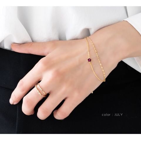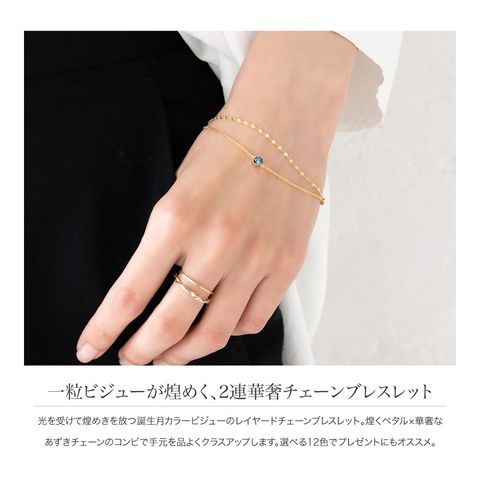 光を受けて煌めきを放つ誕生月カラービジューのレイヤードチェーンブレスレット。煌くペタル×華奢なあずきチェーンのコンビで手元を品よくクラスアップします。選べる12色でプレゼントにもオススメ。