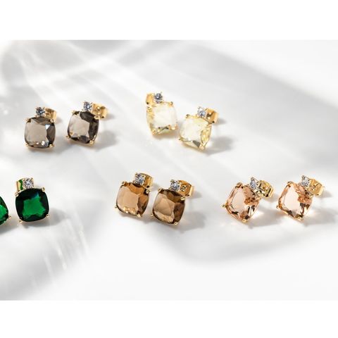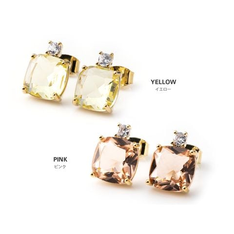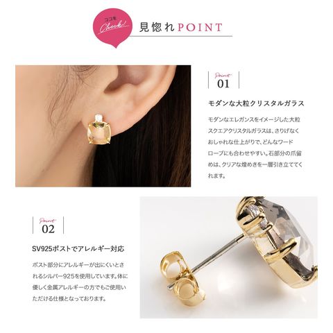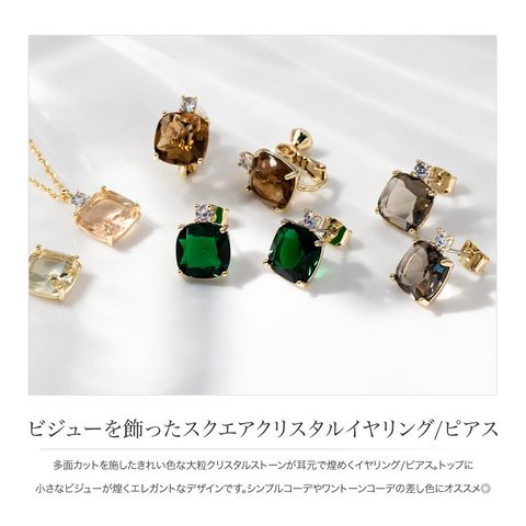 モダンなエレガンスをイメージした大粒スクエアクリスタルガラスは、さりげなくおしゃれな仕上がりで、どんなワードローブにも合わせやすい。石部分の爪留めは、クリアな煌めきを一層引き立ててくれます。