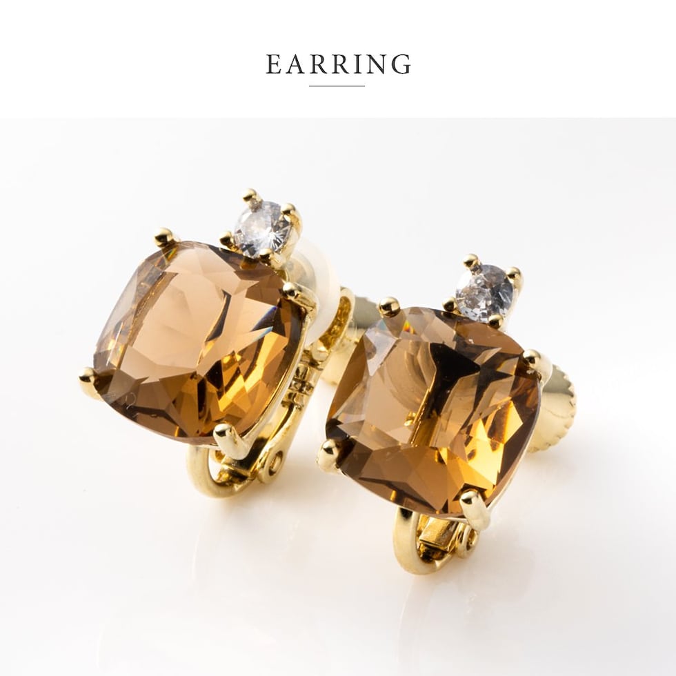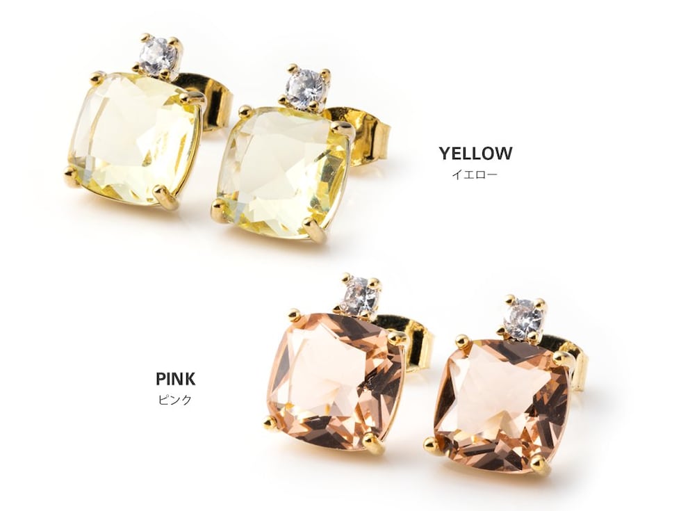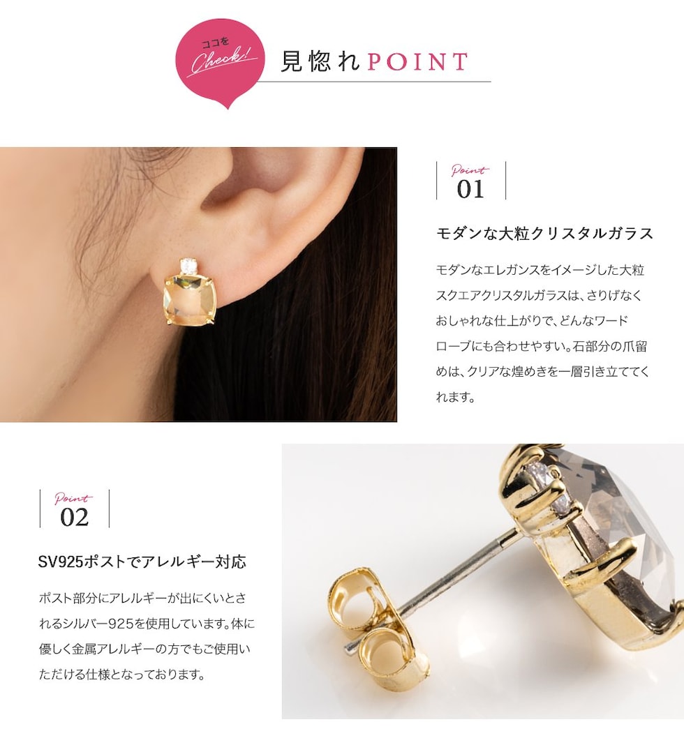 モダンなエレガンスをイメージした大粒スクエアクリスタルガラスは、さりげなくおしゃれな仕上がりで、どんなワードローブにも合わせやすい。石部分の爪留めは、クリアな煌めきを一層引き立ててくれます。