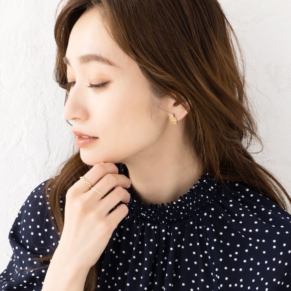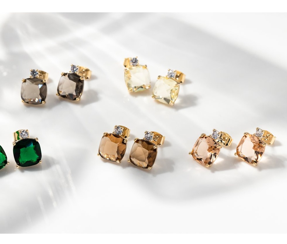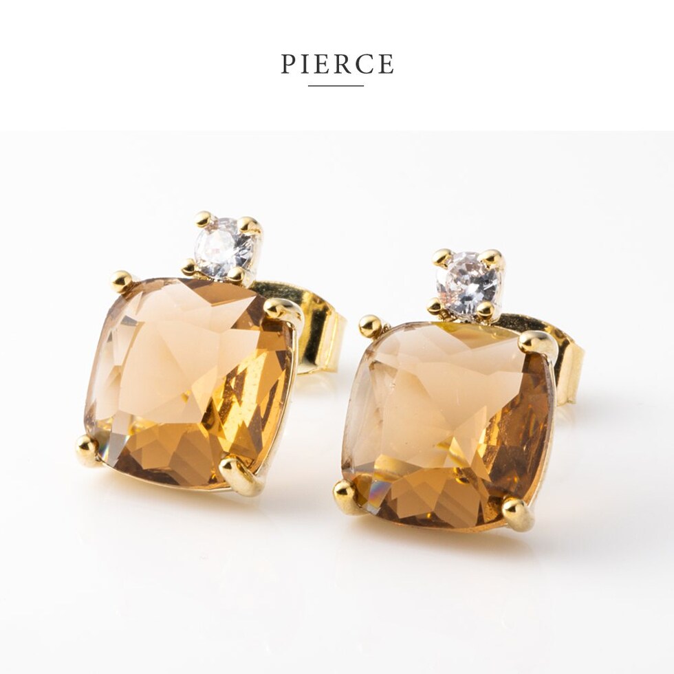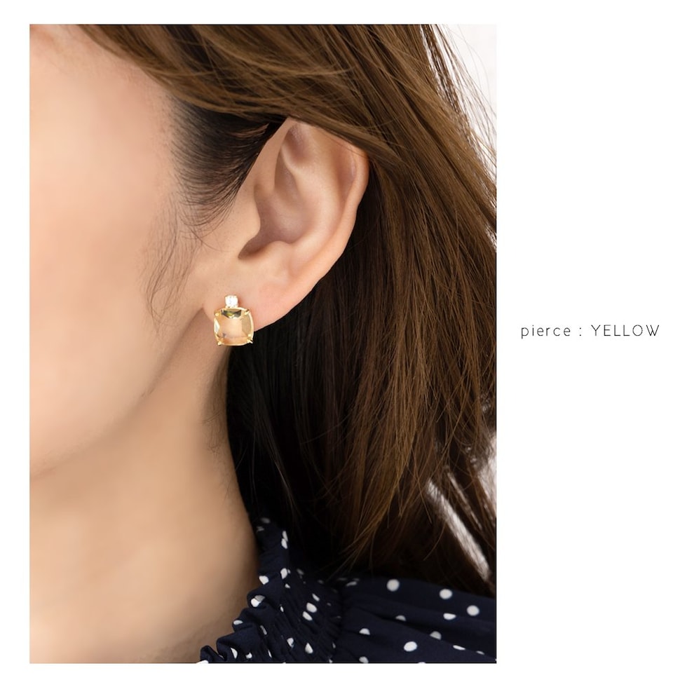 モダンなエレガンスをイメージした大粒スクエアクリスタルガラスは、さりげなくおしゃれな仕上がりで、どんなワードローブにも合わせやすい。石部分の爪留めは、クリアな煌めきを一層引き立ててくれます。