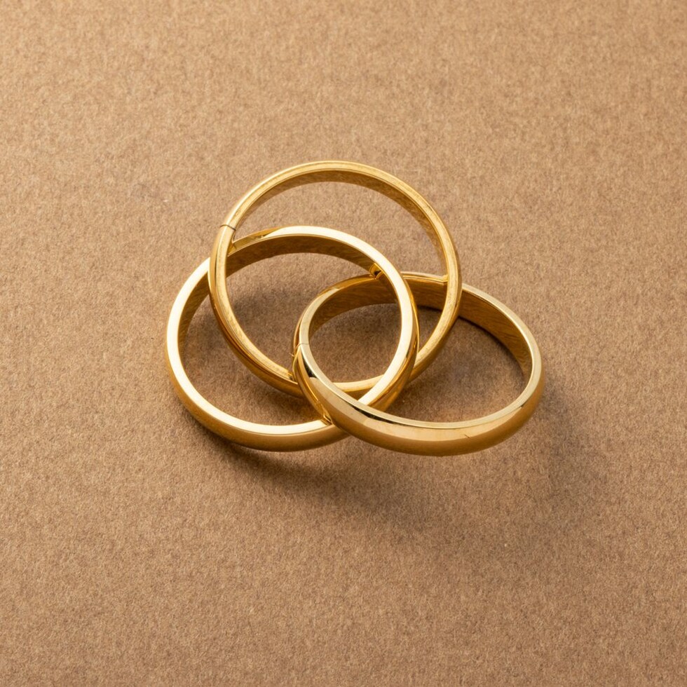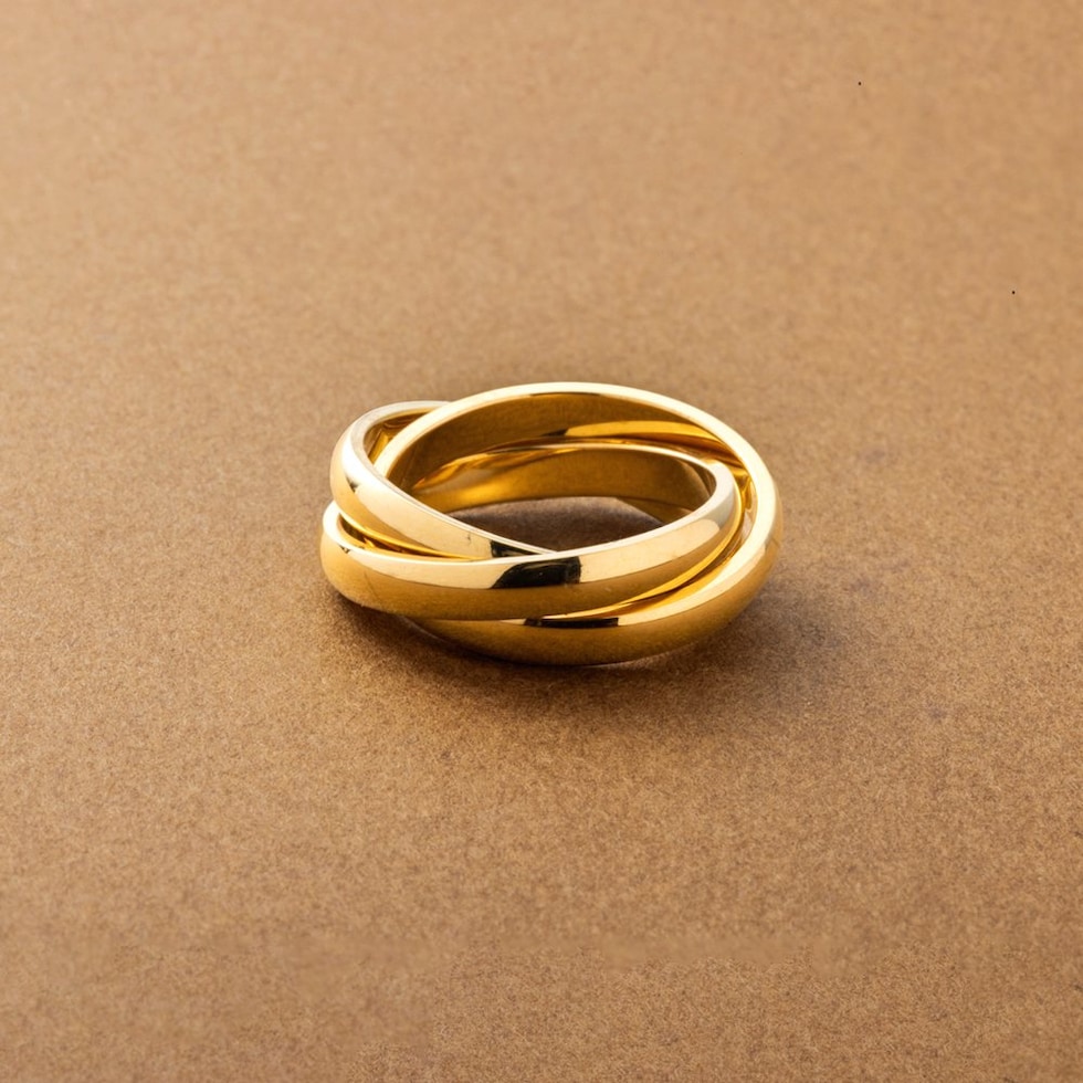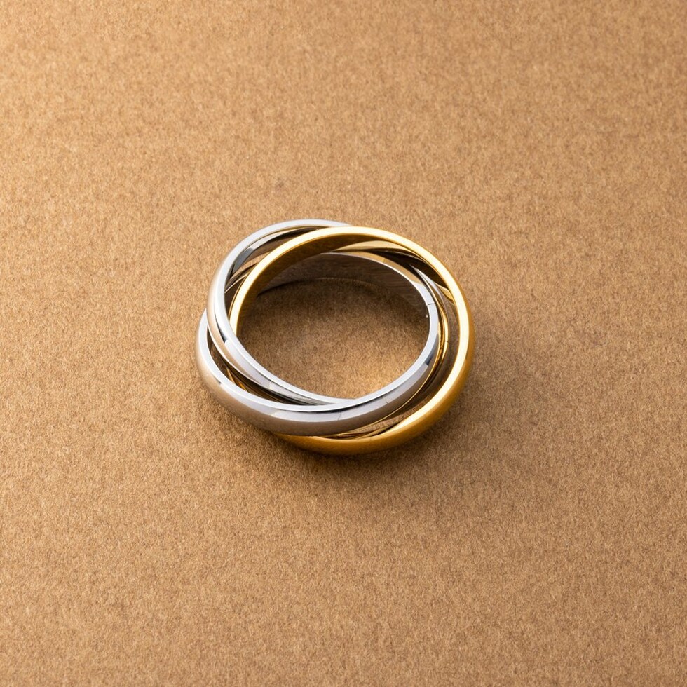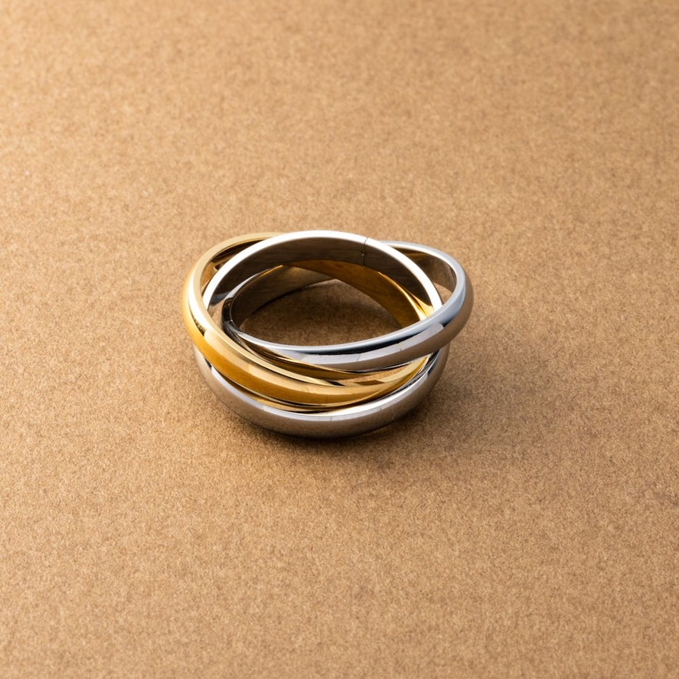 手元にモダンな存在感をプラスするトリプルツイストのリング。3つの大きめなメタルリングが重なったデザインが洗練された手元を演出してくます。錆びにくいステンレス製でデイリーに活躍しそう。