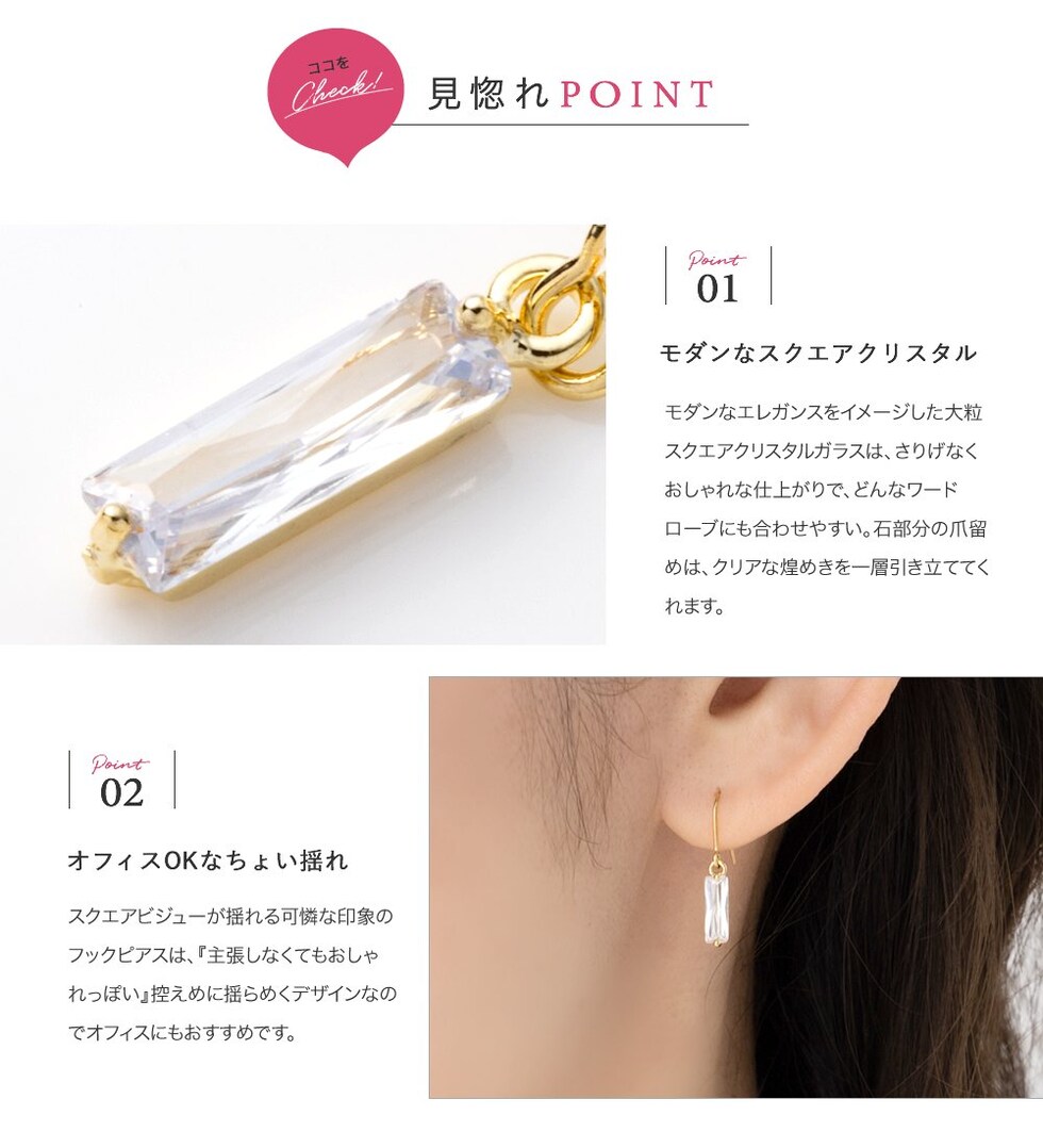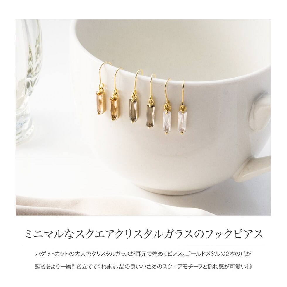 スクエアビジューが揺れる可憐な印象のフックピアスは、『主張しなくてもおしゃれっぽい』控えめに揺らめくデザインなのでオフィスにもおすすめです。