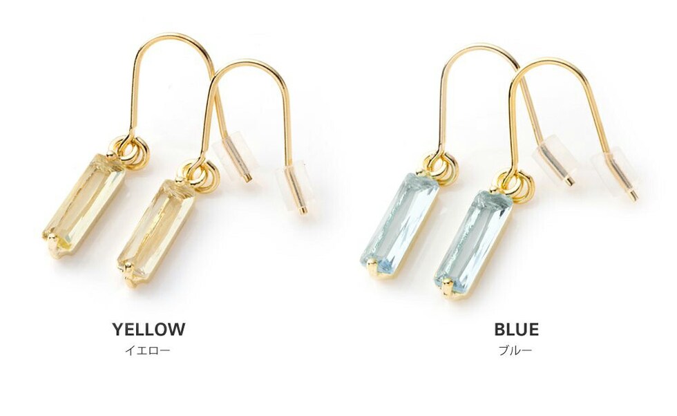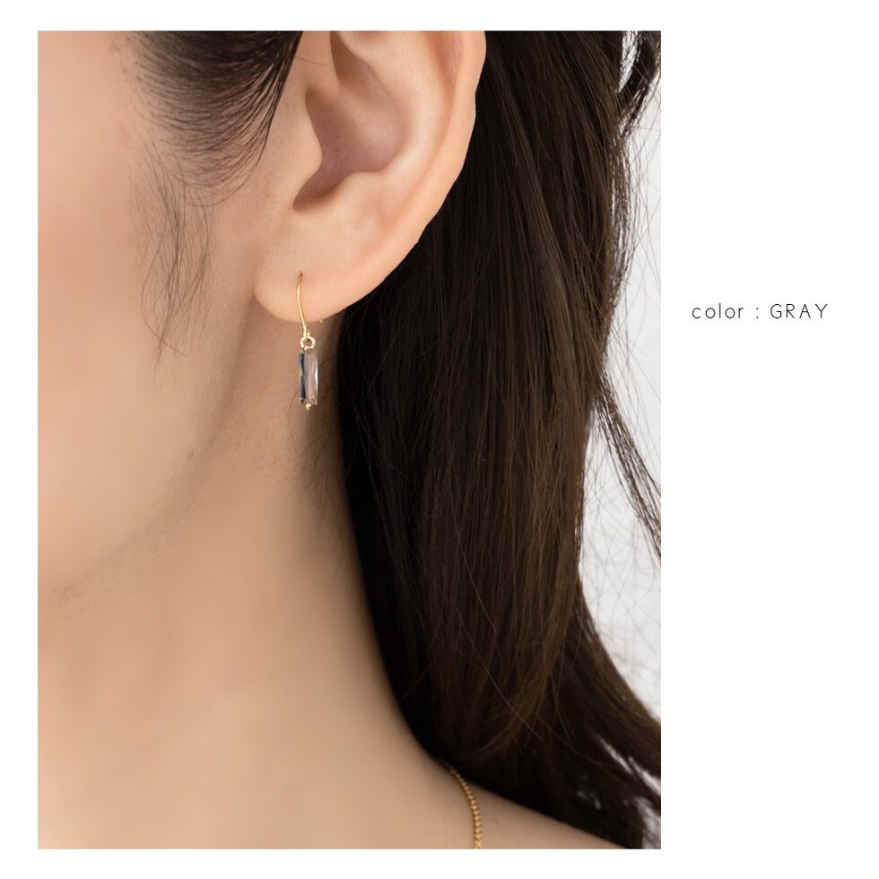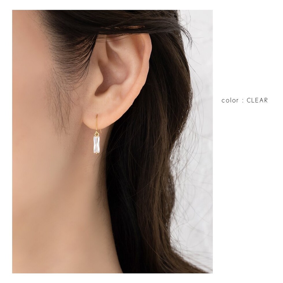 バゲットカットの大人色クリスタルガラスが耳元で煌めくピアス。ゴールドメタルの2本の爪が輝きをより一層引き立ててくれます。品の良い小さめのスクエアモチーフと揺れ感が可愛い◎